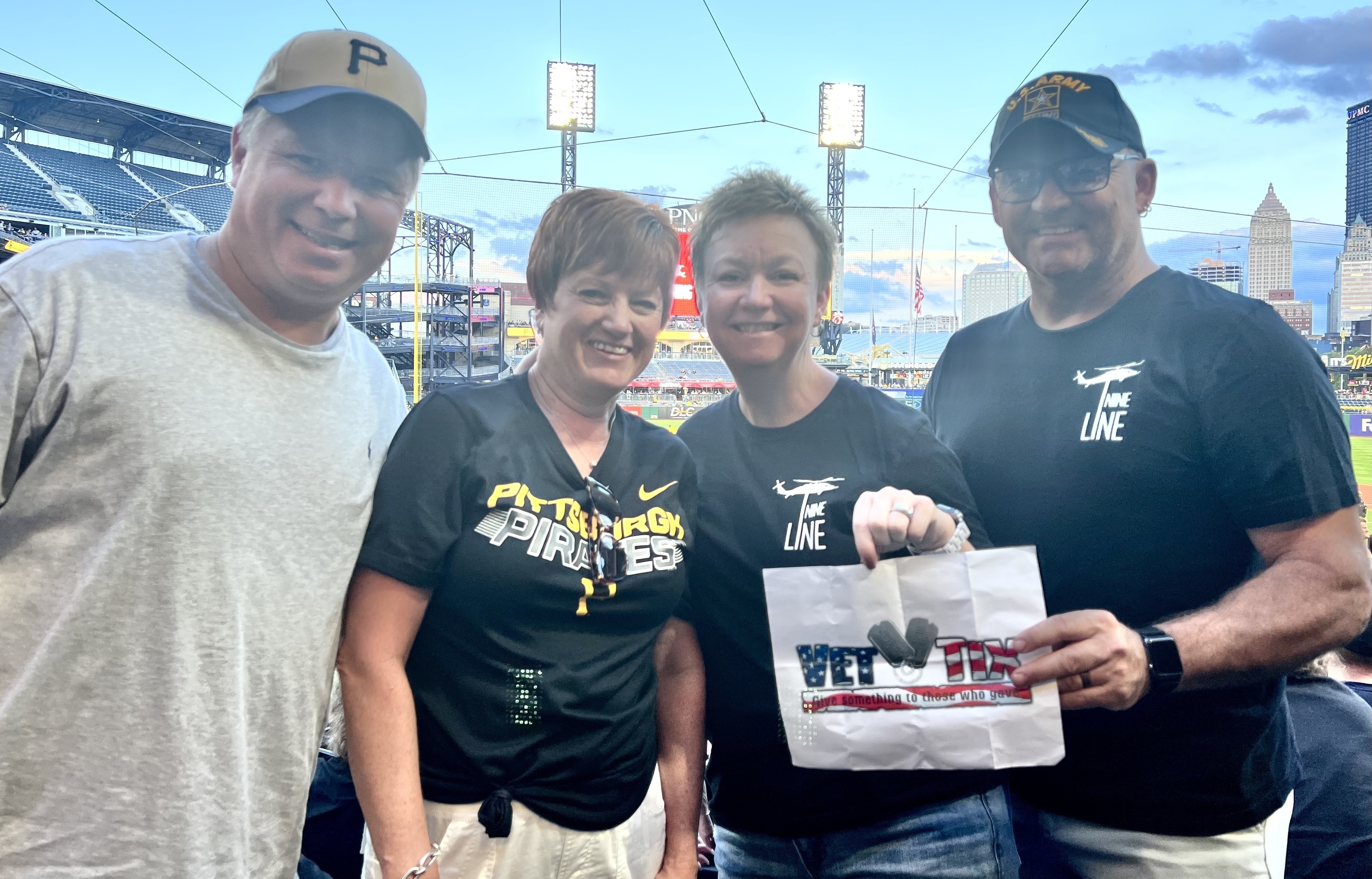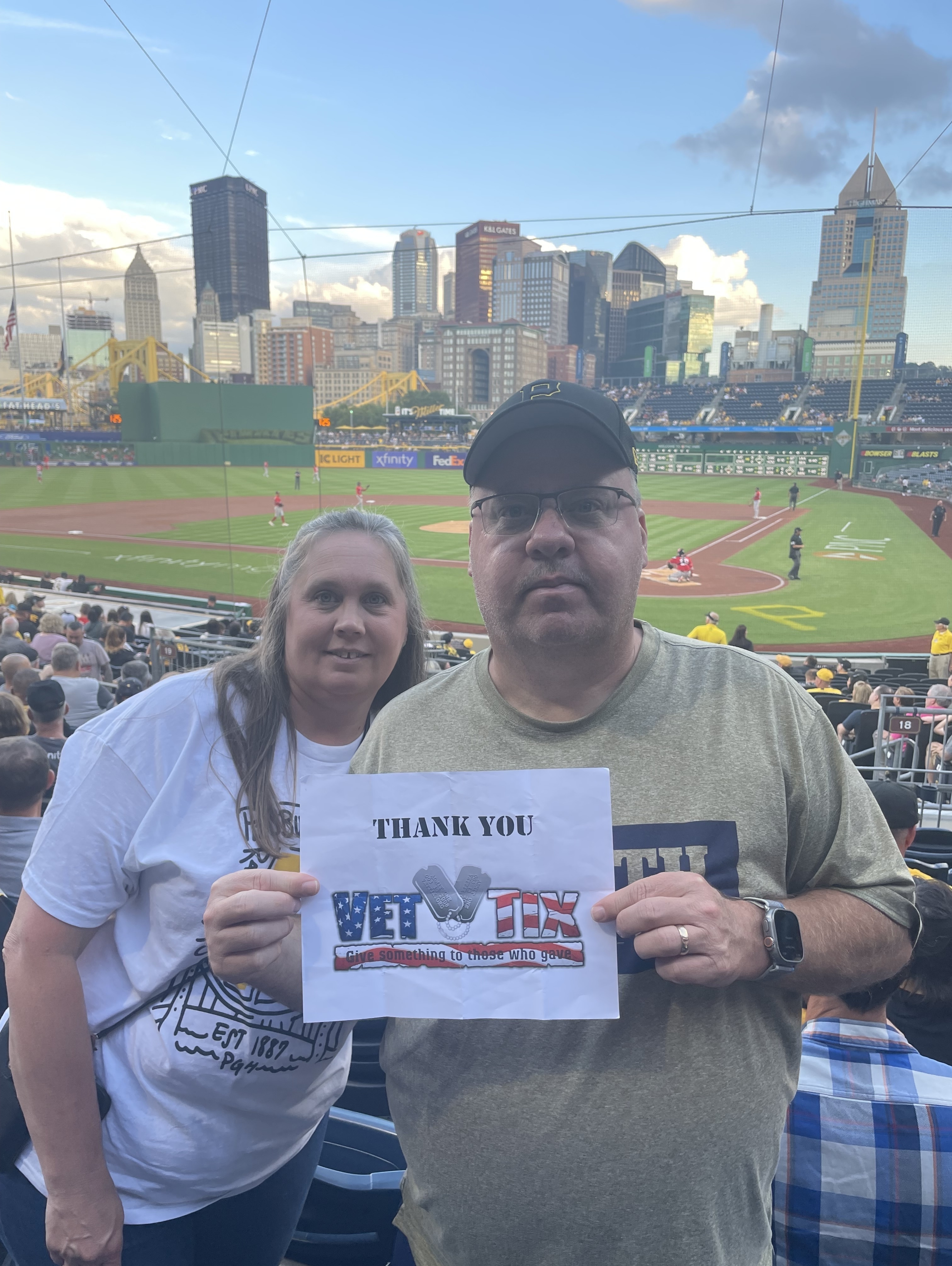 I would like to thank THE PITTSBURGH PIRATES for remembering and giving back to those who served and VETTIX for making it possible. I live in Long Island New York, when these tickets were offered I actually planned a vacation around them. We stayed in Pittsburgh 3 days and attended the Steelers game on Sunday and the Pirates game on Monday and Tuesday. The seats were incredible!!! 20 rows behind home plate! These were among the best seats I ever had for a baseball game!! We were right on top of the action! PNC park was beautiful. The view of the city skyline and bridges beyond centerfield was truly spectacular, amazing and iconic. I cant thank the Pirates Organization enough for this amazing experience! I also caught a T-shirt during the T-shirt toss! Thank- you again!!