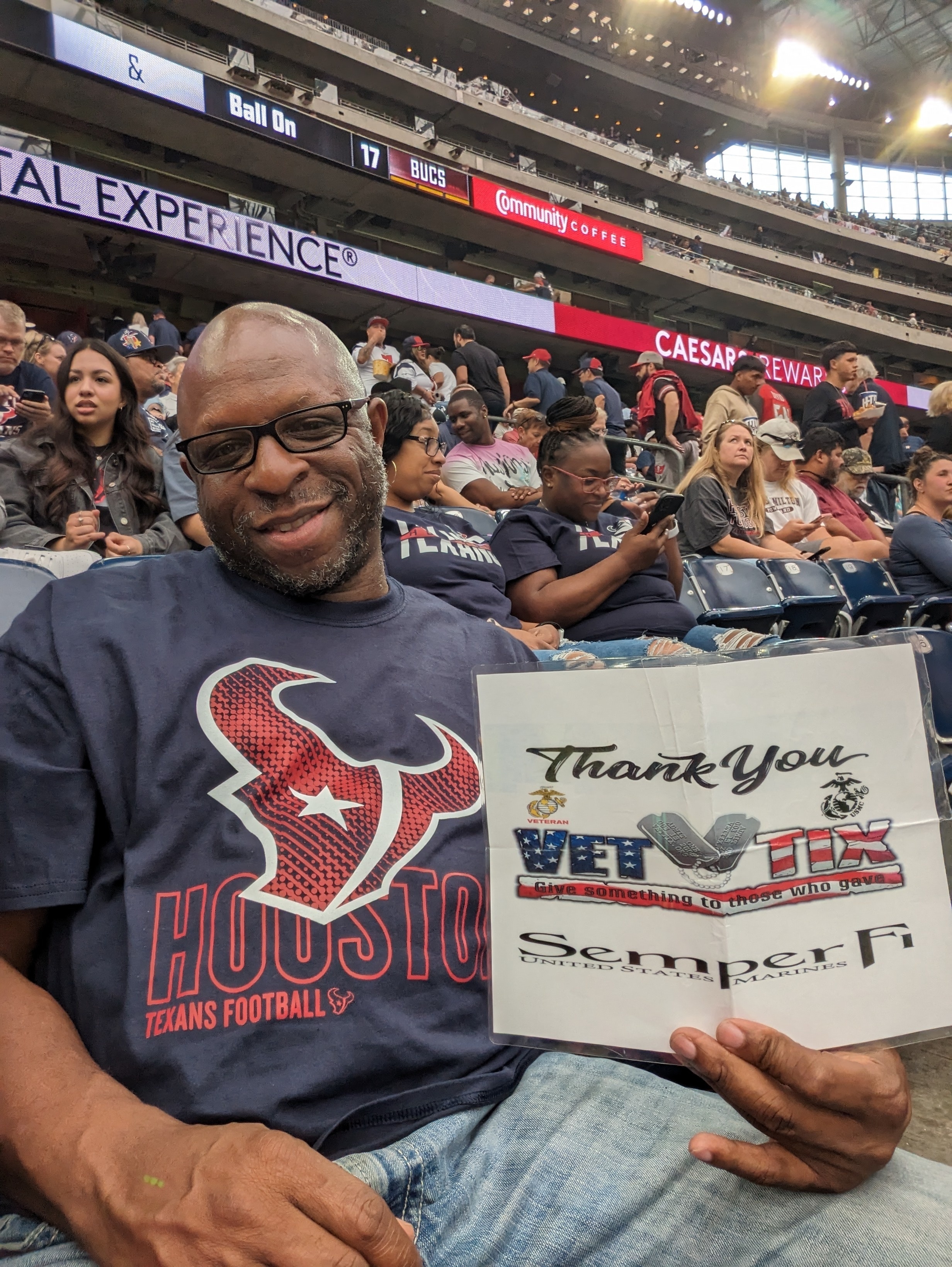 Thank you for the Texans tickets! We had a blast and got to see one of the best games I’ve ever seen. Y’all are so good to us Vets and I appreciate all you do!