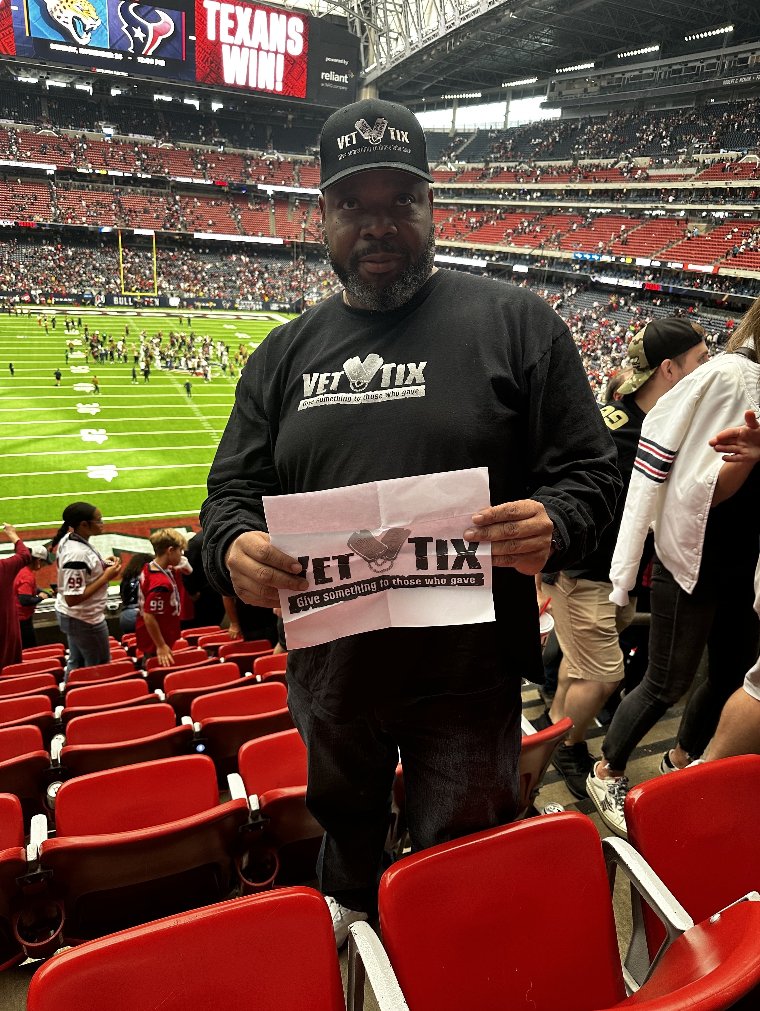 Thank you to all the kind donors: Elite Energy Partners, Eddie R, Susie S, Richard N, Sonja M, Courtney H, Jeff T, Bradley W, Andrew R, Mr Robert R, Lance T, Melanie E, Karen K, Monica A, Maria L, Chris H, Pramod G, J P M, Scott O, Richard O, Kevin O, Hank T, John R M, Teri V, Robert E, Richard M, Brian & J, Brian B, John G, James R B, Eduardo A G, Janna S, Jordan H, Shannon J K, Richard C R, Mark J, Thomas J M, Erick L, Ricardo E A, Billy C, Dennis L, Drew M, Parntipa S, David N, Oscar R, Michael H, N, Dezra White, M, John T G, Ann M, David M, Stacy G, Michael D W, Paul N G, Edward T, Shamara G, Marc S, Dana & V, Scott G, John T R, Joe D, Billy J E, Karen S, Jeffrey P H, Richard H, Lawrence D D, David E, Myrna S, Barry J S, Elaine O, Kathryn S G, Michael D S, Marty H, Rhoda C, Gene N, Larry & D, Art P, Sixto P, Dennis L R, Genevieve H. These tickets were great seats and we got to enjoy the game closer than I ever have! It truly was a fun experience for myself and my friends. We made it a guys weekend before thanksgiving and this game was the highlight of our weekend especially since the Texans won! Without all the donors and Vet tix, we never would have experienced such a good game with our view! Thanks again, it’s greatly appreciated!