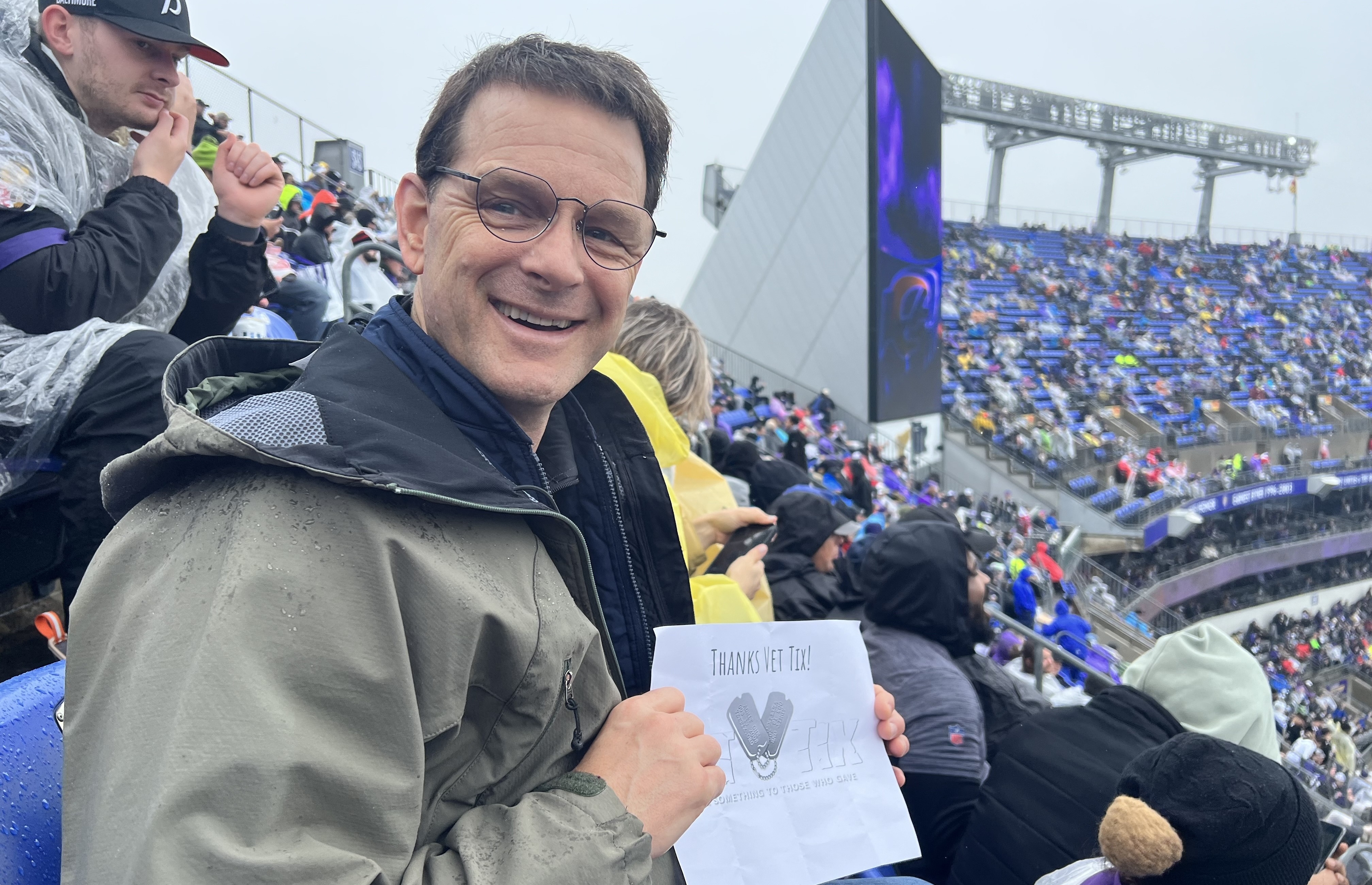 I would like to take a moment to thank Vet Tix and Veterans Tickets Foundation for allowing us to take part in a wet but exciting Raven's game against the LA Rams. The seats were great and the atmosphere left smiles on our faces for the entire day. I can't tell you how much we appreciated this experience and are so thankful to those who make it happen. WOW! What a game! What a memory for me and my husband. THANK YOU!