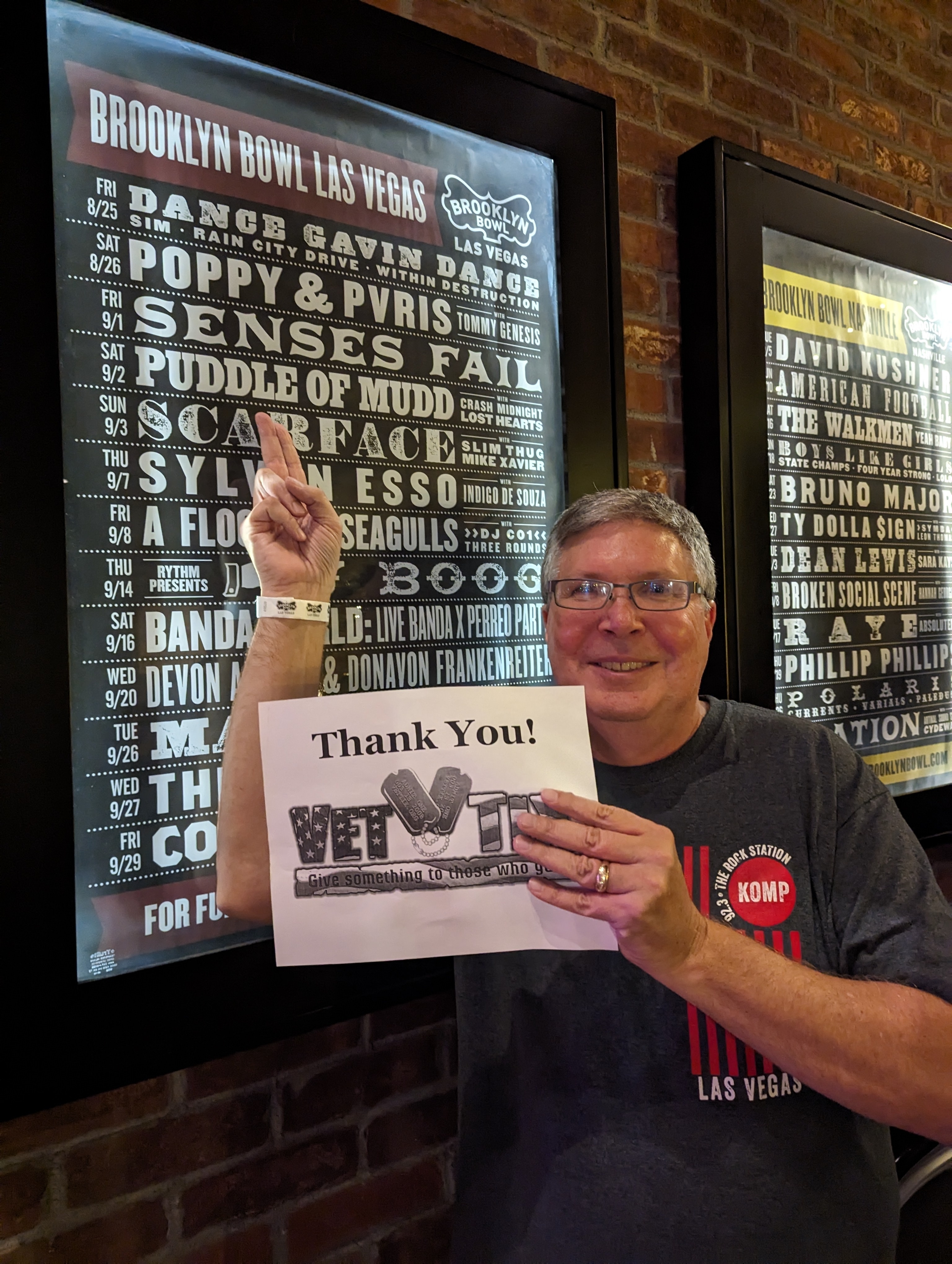 Thank you Brooklyn Bowl Las Vegas for the Puddle of Mudd tickets. I had an awesome time! Great venue, atmosphere, and music. Thank you for all you do for military and retired service members.