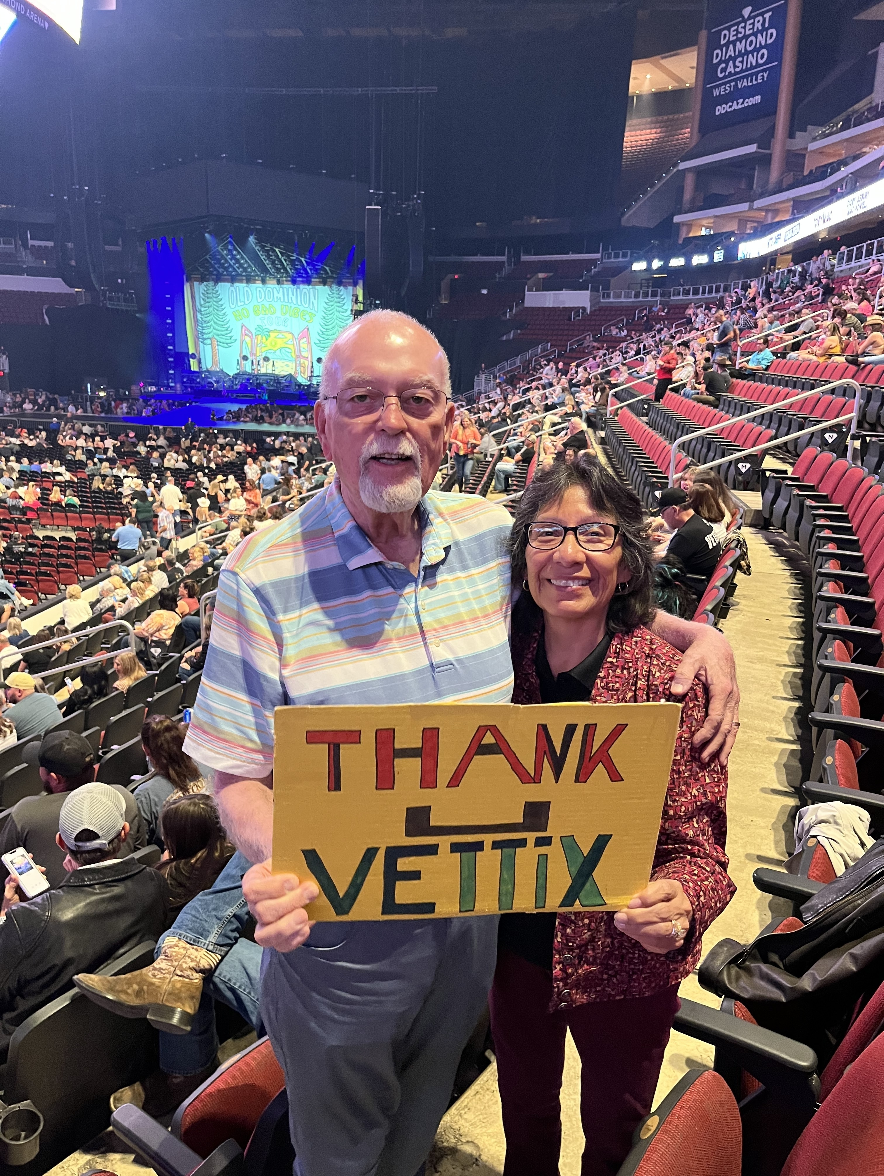 I would like to thank the Messina Touring Group, LLC for the donation to VetTix that gave my wife and I the opportunity to attend a great concert at the Desert Diamond Arena. We enjoyed the concert very much, and would not have been able to see Old Dominion, Chase Rice, and Kylie Morgan in concert otherwise. The show was fabulous!