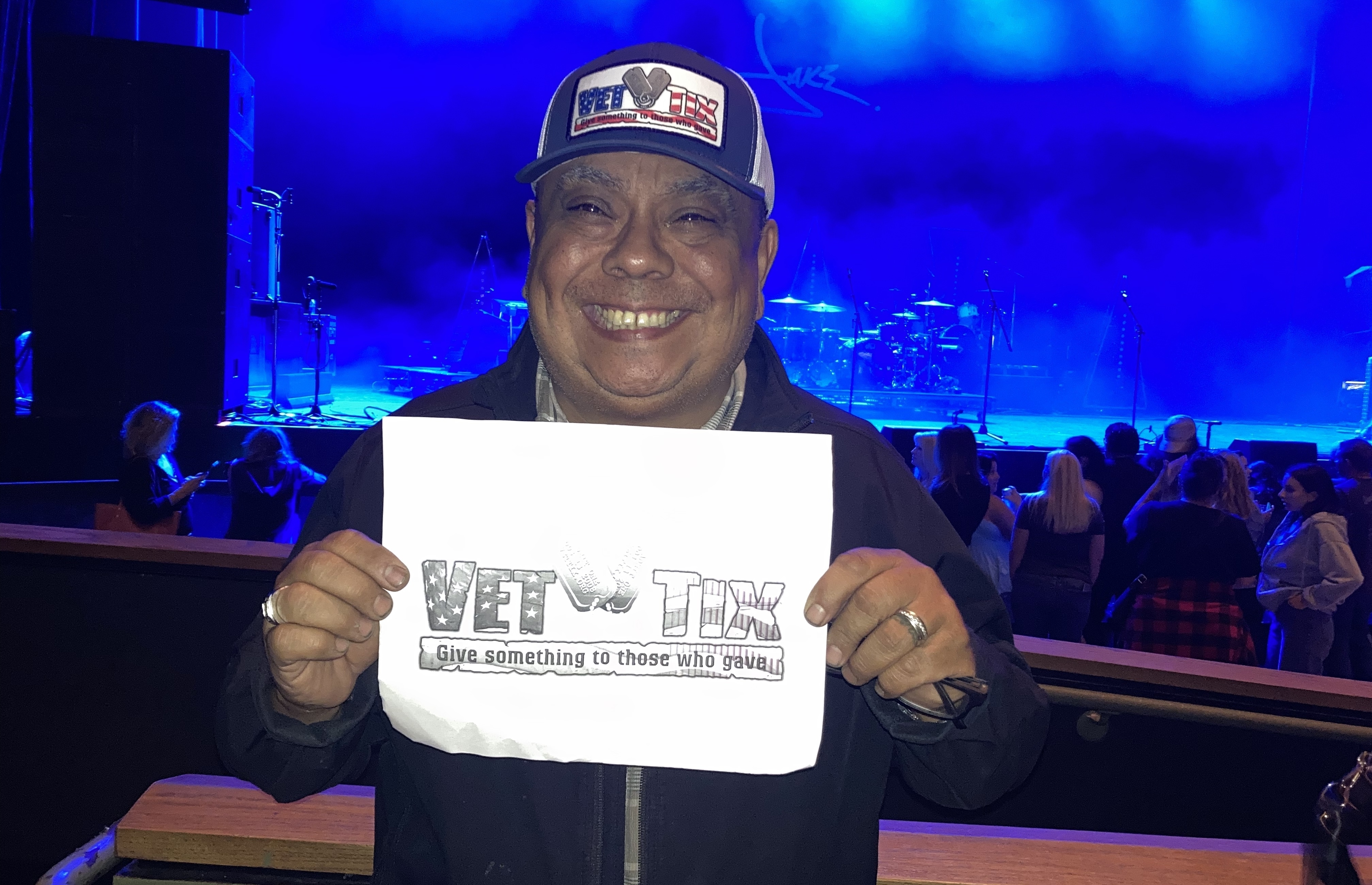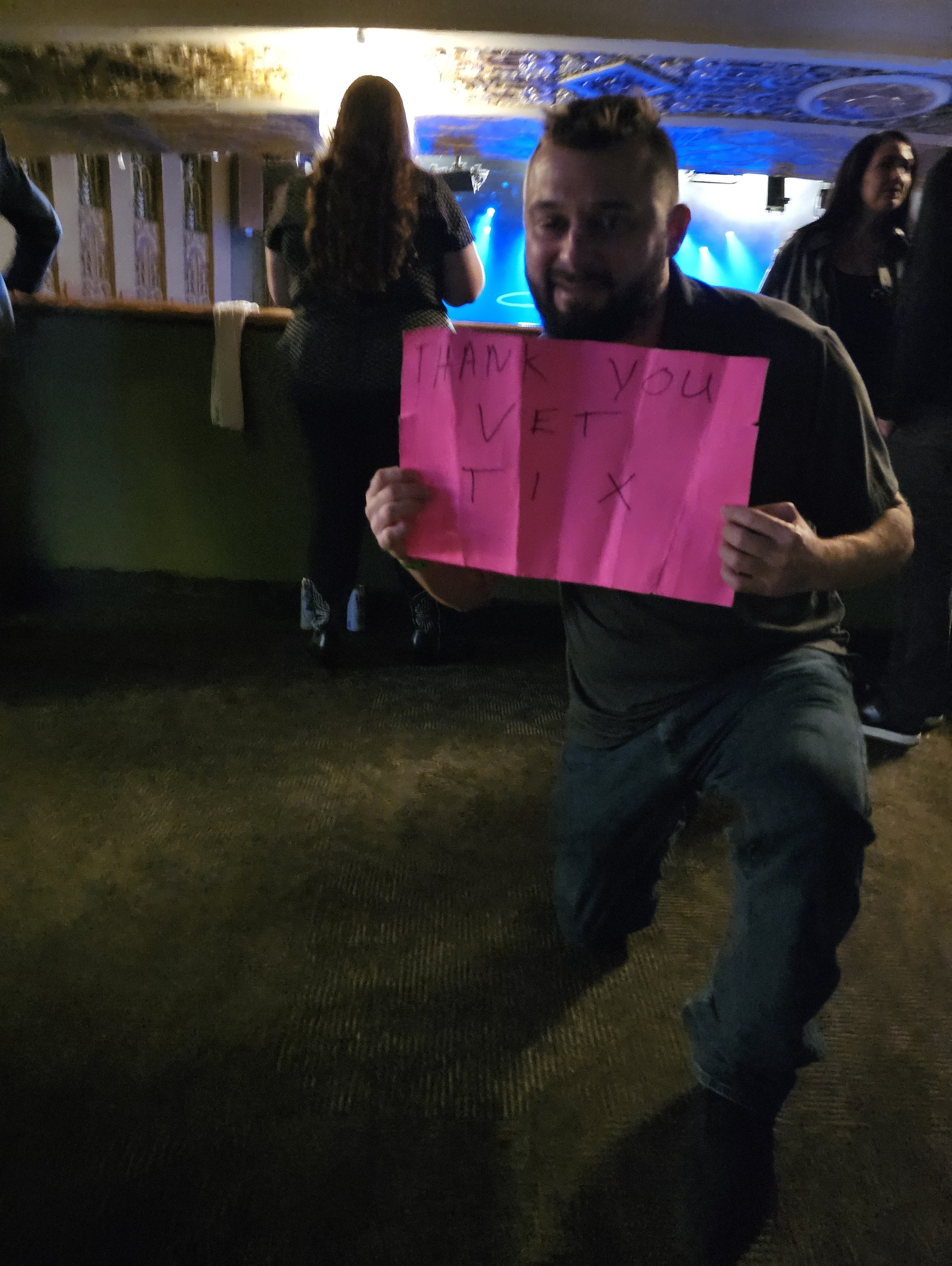 Hello I just wanted to say thank you so much for the tickets. I appreciate it . It was a good time to get out with my son. Normally it's a blast but this time some drunk guy spilled beer over me and my son and threw my vet tix hat in the crowd. So looks like I'm going to buy a new hat. That's why it's not in the picture.