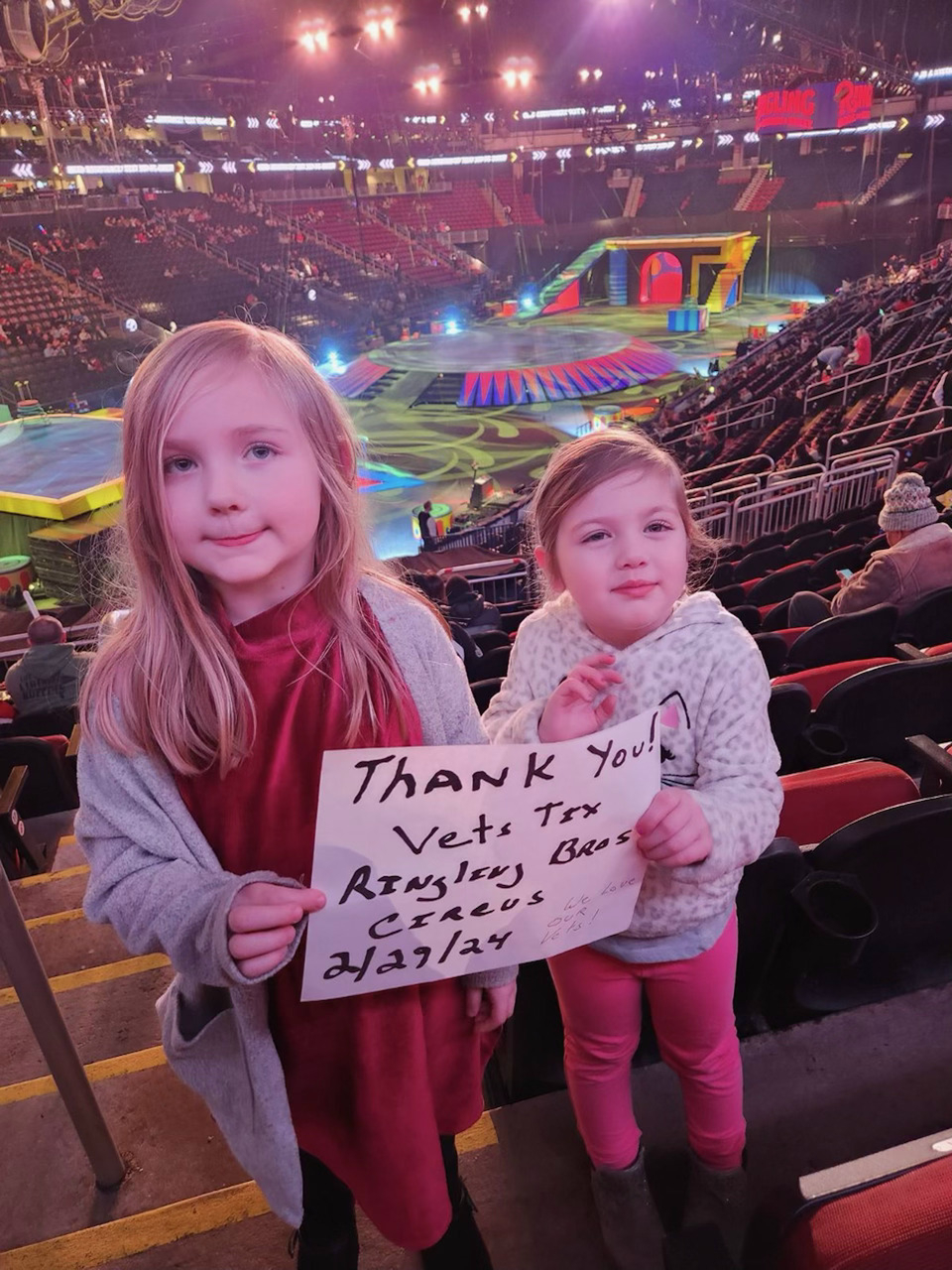 Thank you for your very generous donation of tickets. Vettix and supporters such as you make a difference for everyone. My photo shows the two small girls at the Circus. They are very special little ladies to me. Their grandfather was my close friend an ex Marine and a fellow vet. Unfortunately he passed. I know in my heart Steve is looking down on us. He like I can not say enough Thanks. Semper Fi. Thank you . You brought a special smiles to two little ladies.