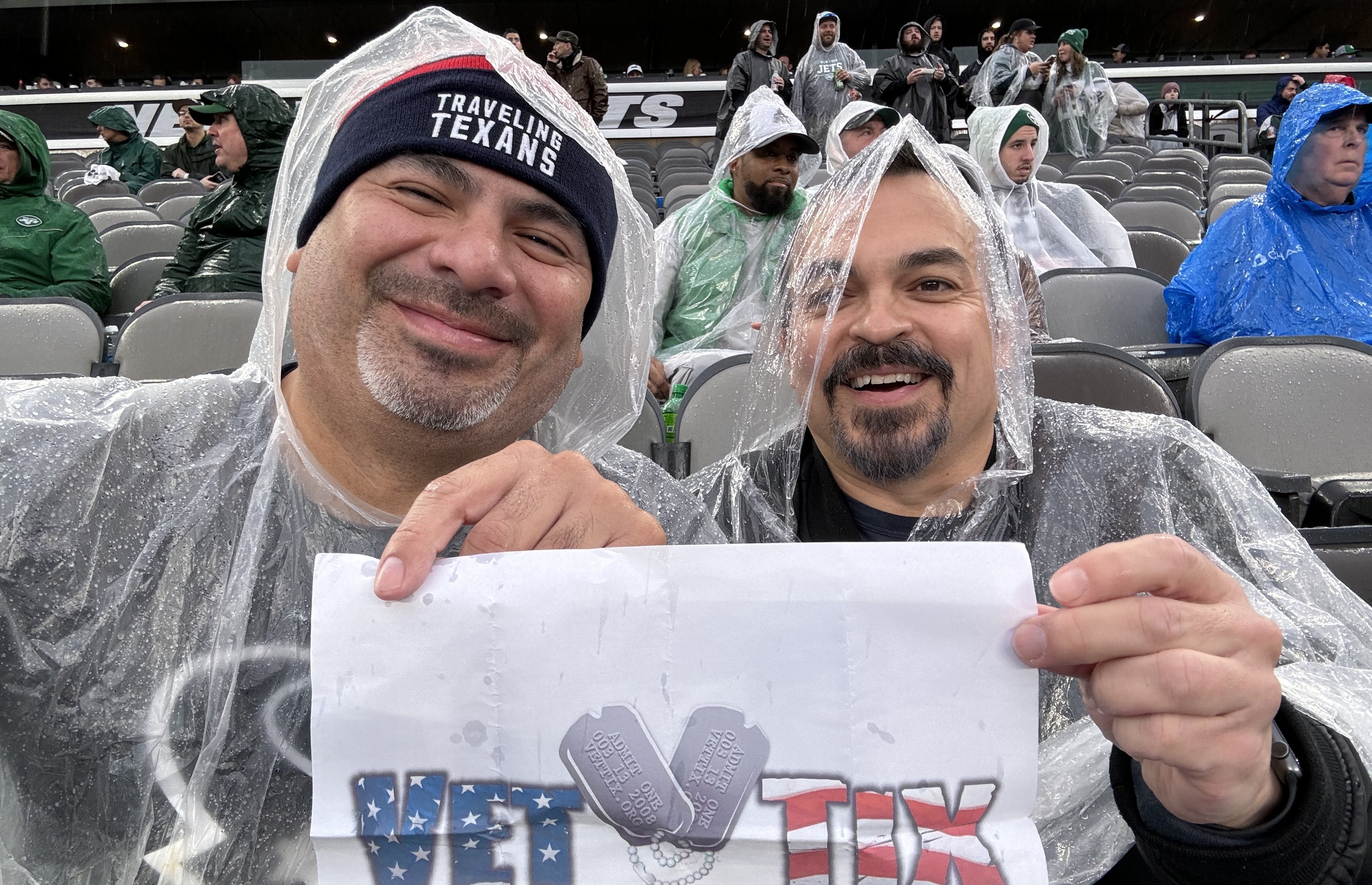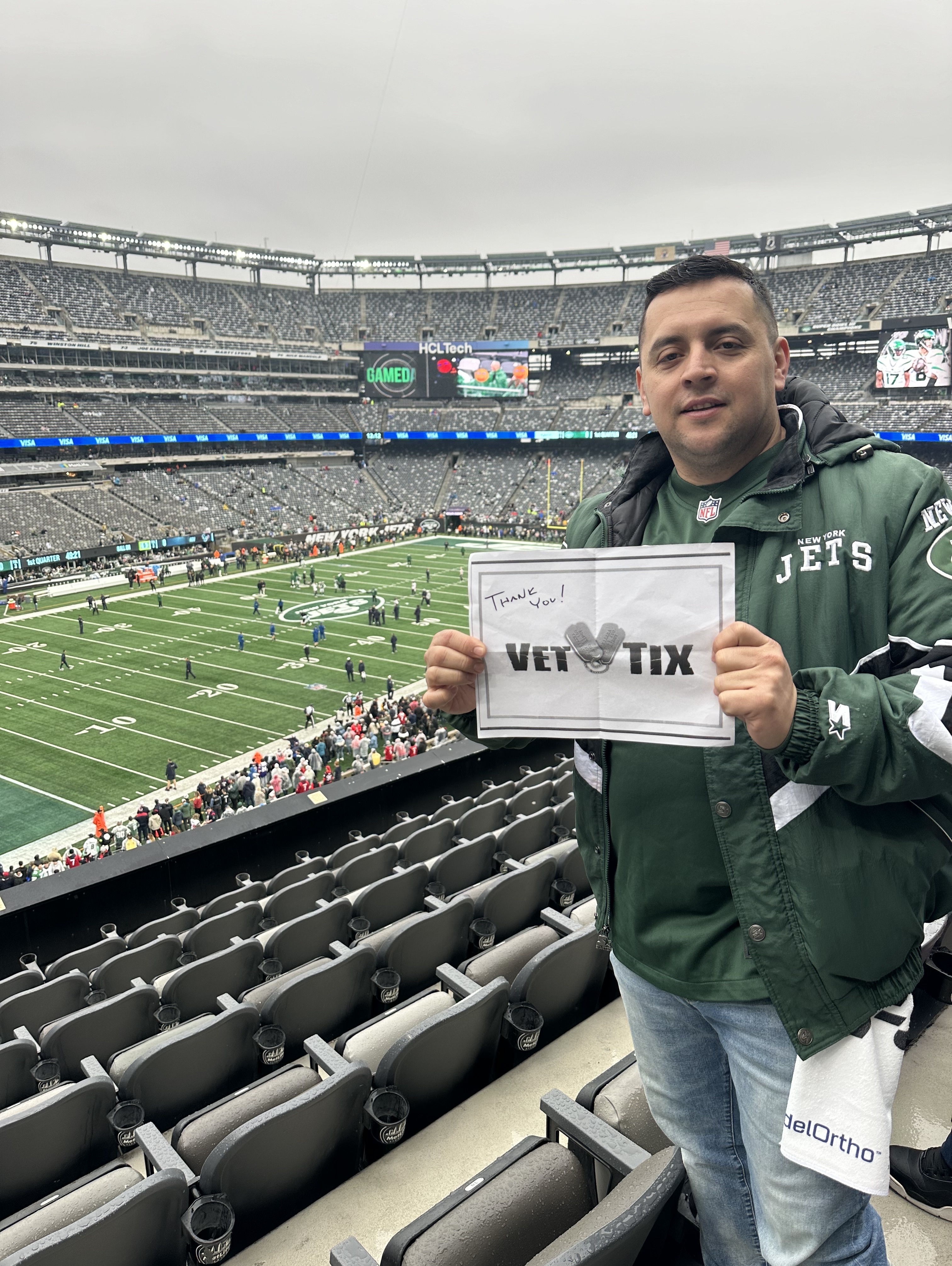 A special thanks to - Gary m. S, Dipak P, John C, Anthony G, Steven H, Eugene I, Michael C, Christopher S, Frank T, Shawn F, Peter G, Thomas H, John M, Marc F, Brian M, James H, Shawn allan Z, Frank K, Phil G, Kayla m. J, Mark e. M, Thomas w e J, Ryan t. J, Mr Robert R, Scott M, Patricia N, Joseph F, Jon S, Morris H, Jeffrey C, Cynthia N, Barry C, Arthur C, John M, Ki H, Christopher D, Martin K, Jack S, Amit B, Karl V, Frank D, Richard S, Brian S, Lori s. J, John R, John Z for the great seat (we were so dry as it poured all day), great WIN, great food and great time. It was also special to see Marine Corporal Todd Nicely being honored by the Jets as the VetTix Veteran of the Game with his on field presence which draw a standing ovation from the crowd. Marine Corporal Todd Nicely was awarded a slew of field commendations and sadly lost both his legs and partial left arm in battle. Thank you all for you generous support of our Veterans! God Bless!