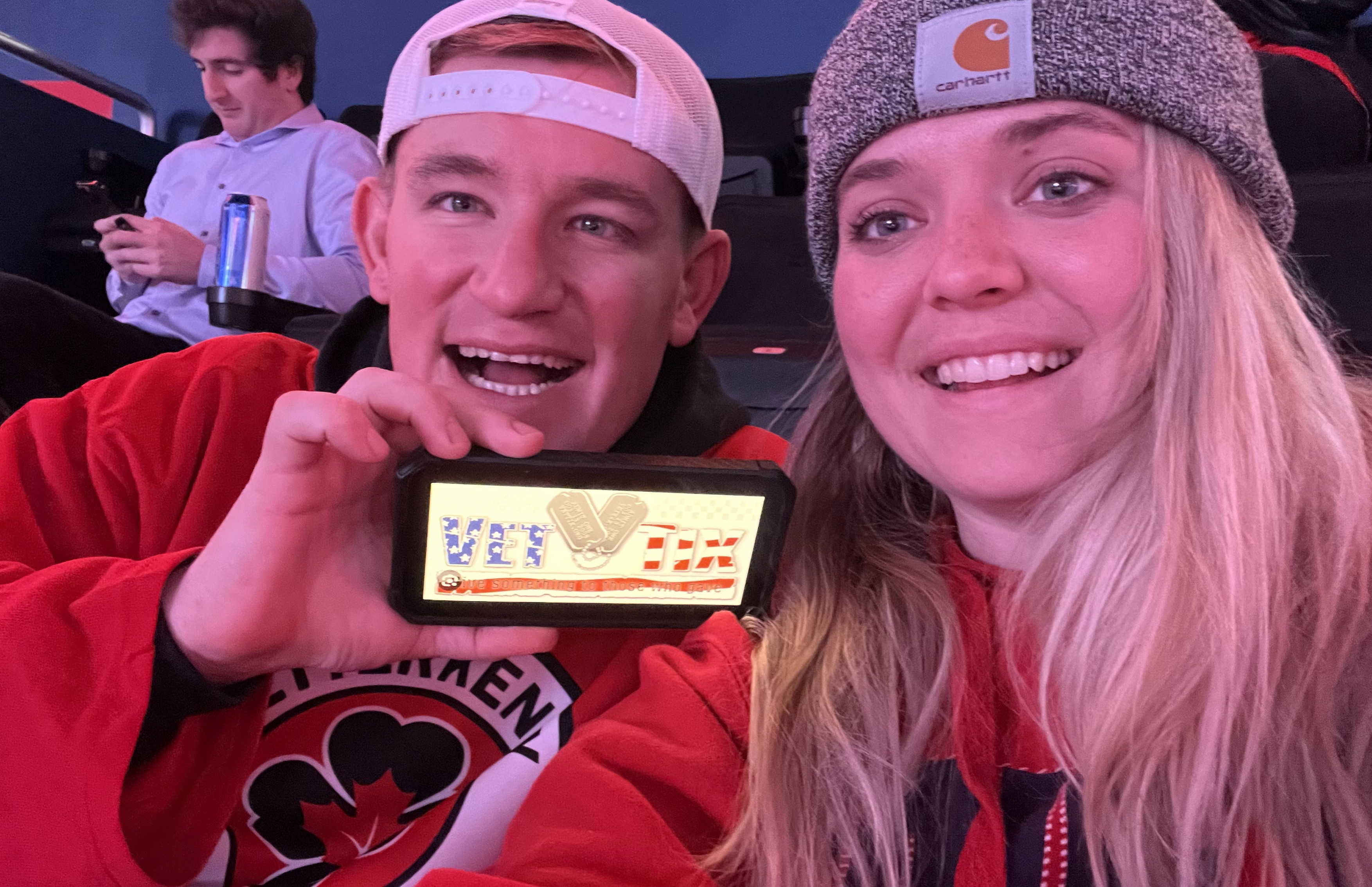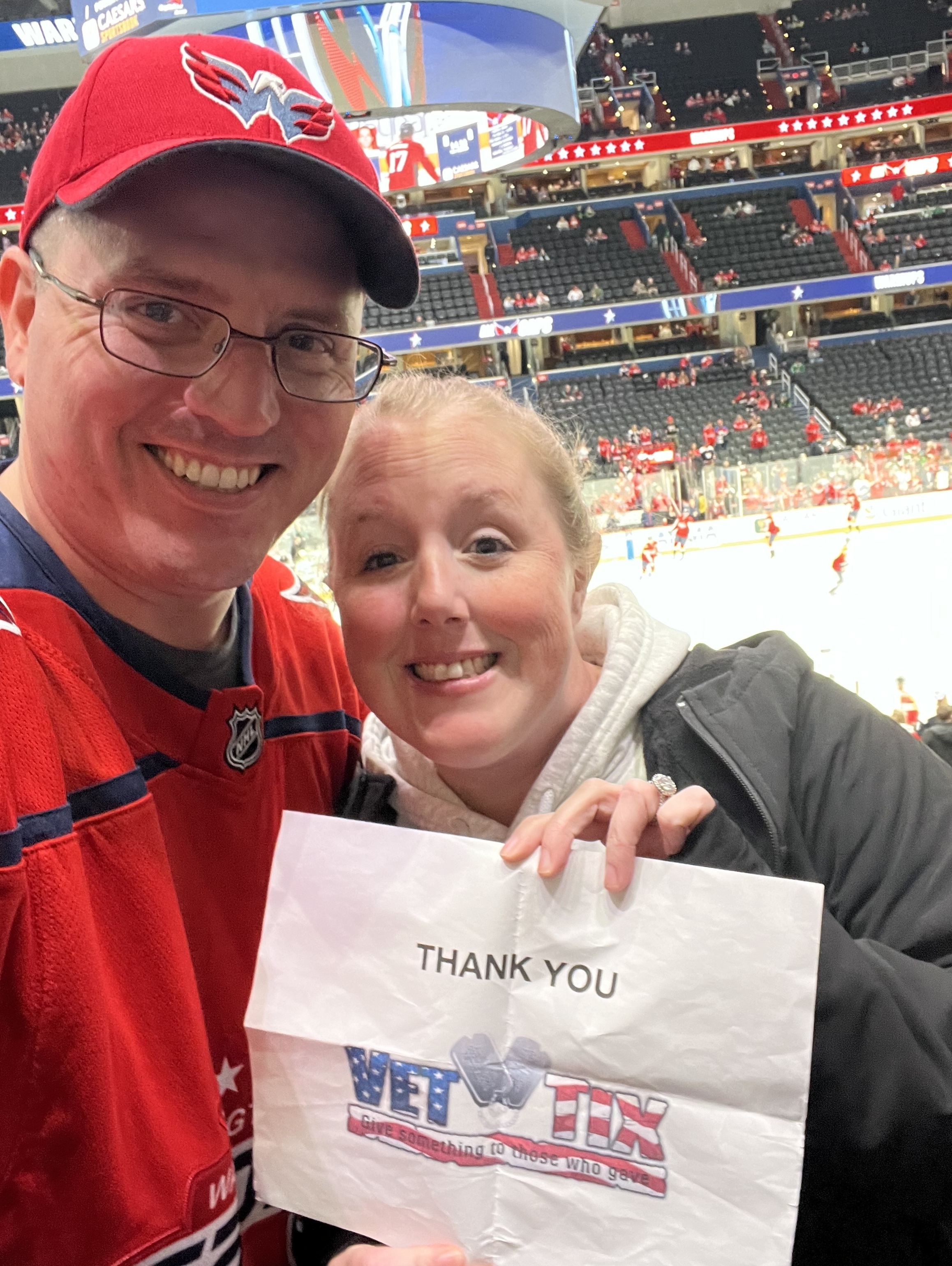 Thank you, Monumental Sports! My husband and I, both vets, are huge Capitals fans and make it to a few games a year usually. We buy seats in the 400 level normally, so imagine our surprise to get these awesome 100 level seats- what a treat! We are so appreciative- Go Caps!