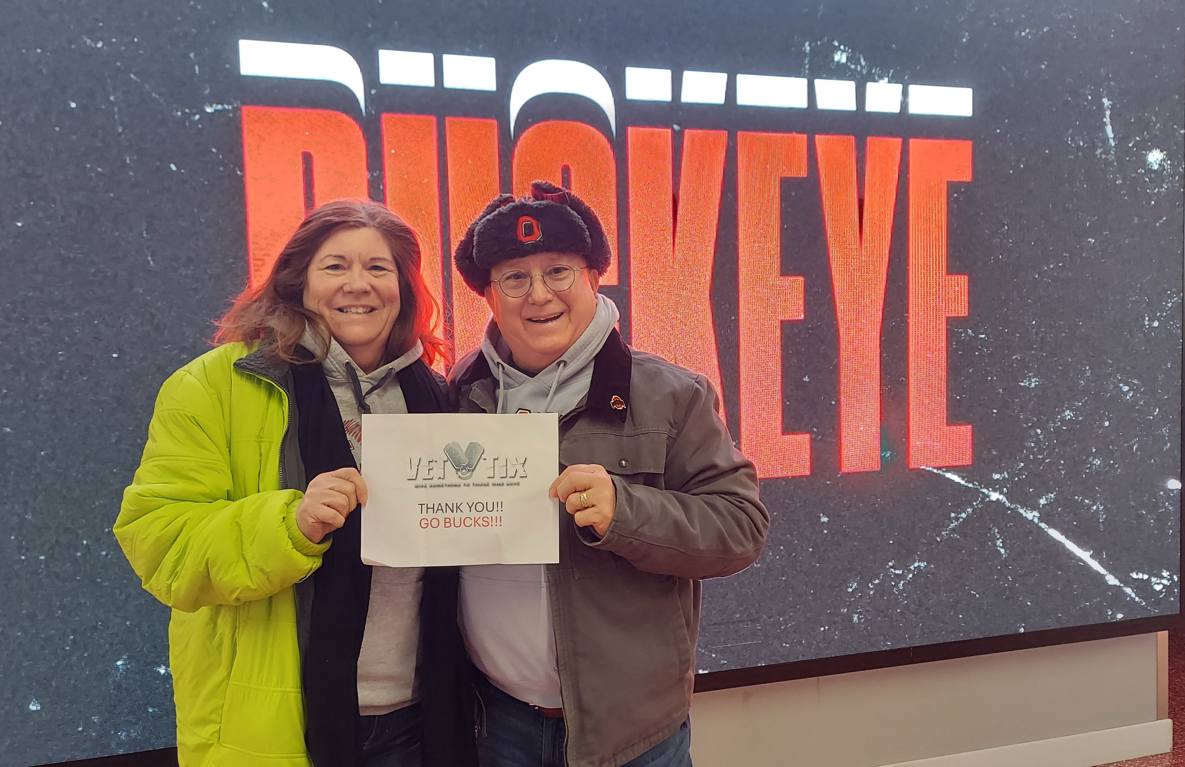We are a house divided. Melissa for Ohio State, Me for Notre Dame. Thank you VetTix and Ohio State Athletics for helping this house divided come together and enjoy a night together to cheer for both of our teams.