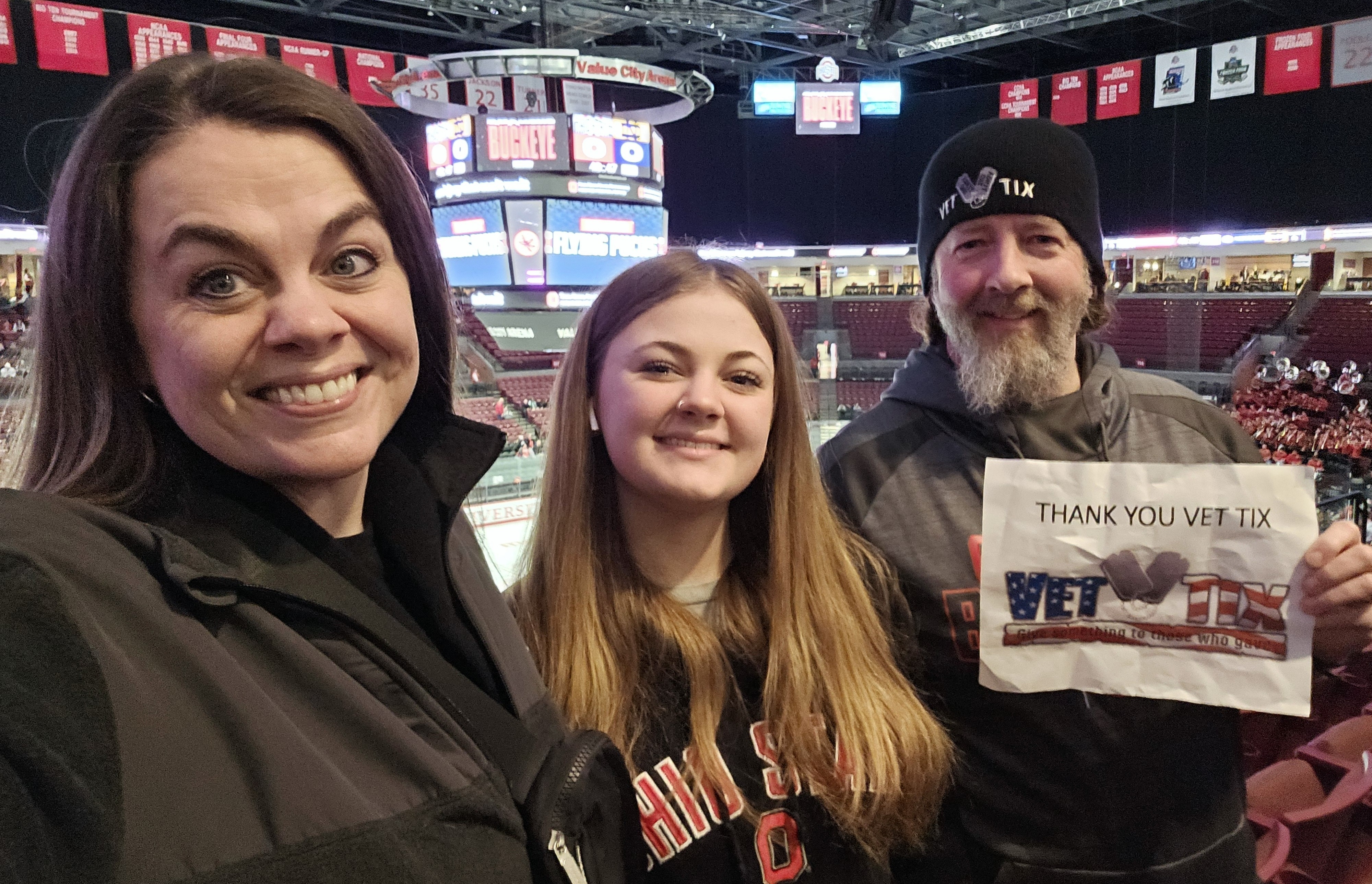 Greetings to our friends at Ohio State Athletics! We just wanted to say thank you for the opportunity to attend a Buckeyes hockey game at the Schott last night. Unfortunately the game didn't go great but we had a great night spending an evening as a family. We appreciate the generosity and your support for our military and veterans.
