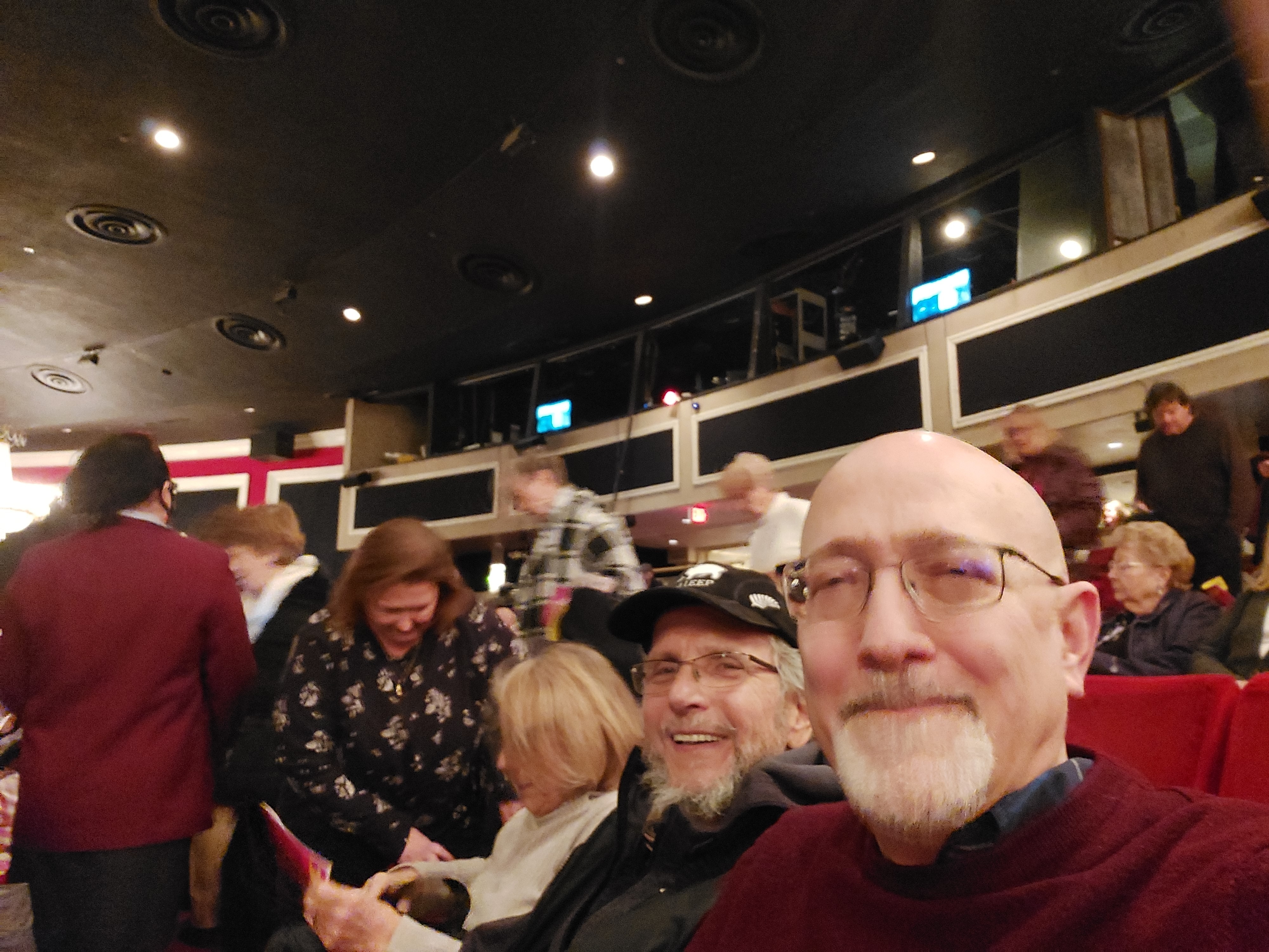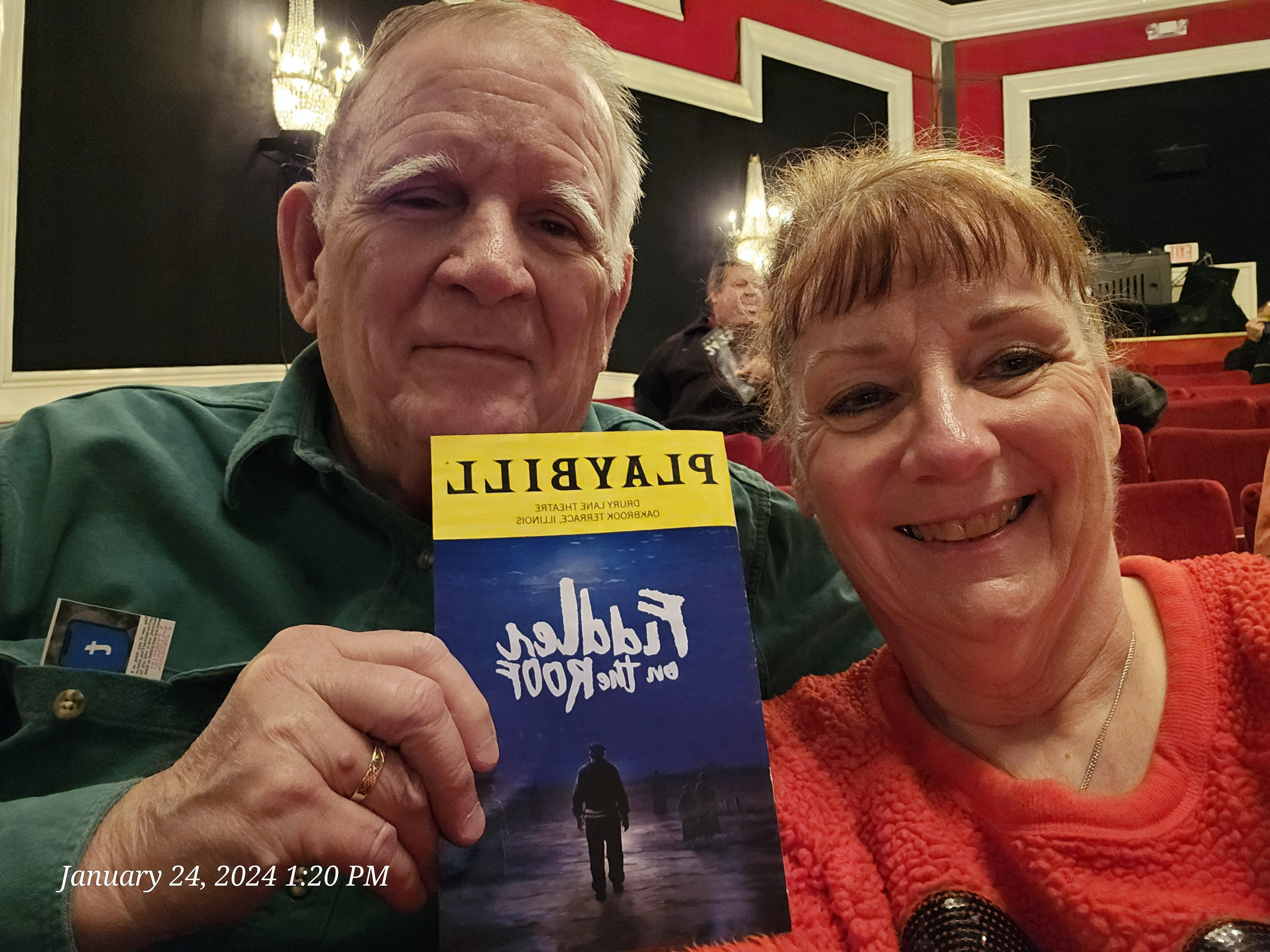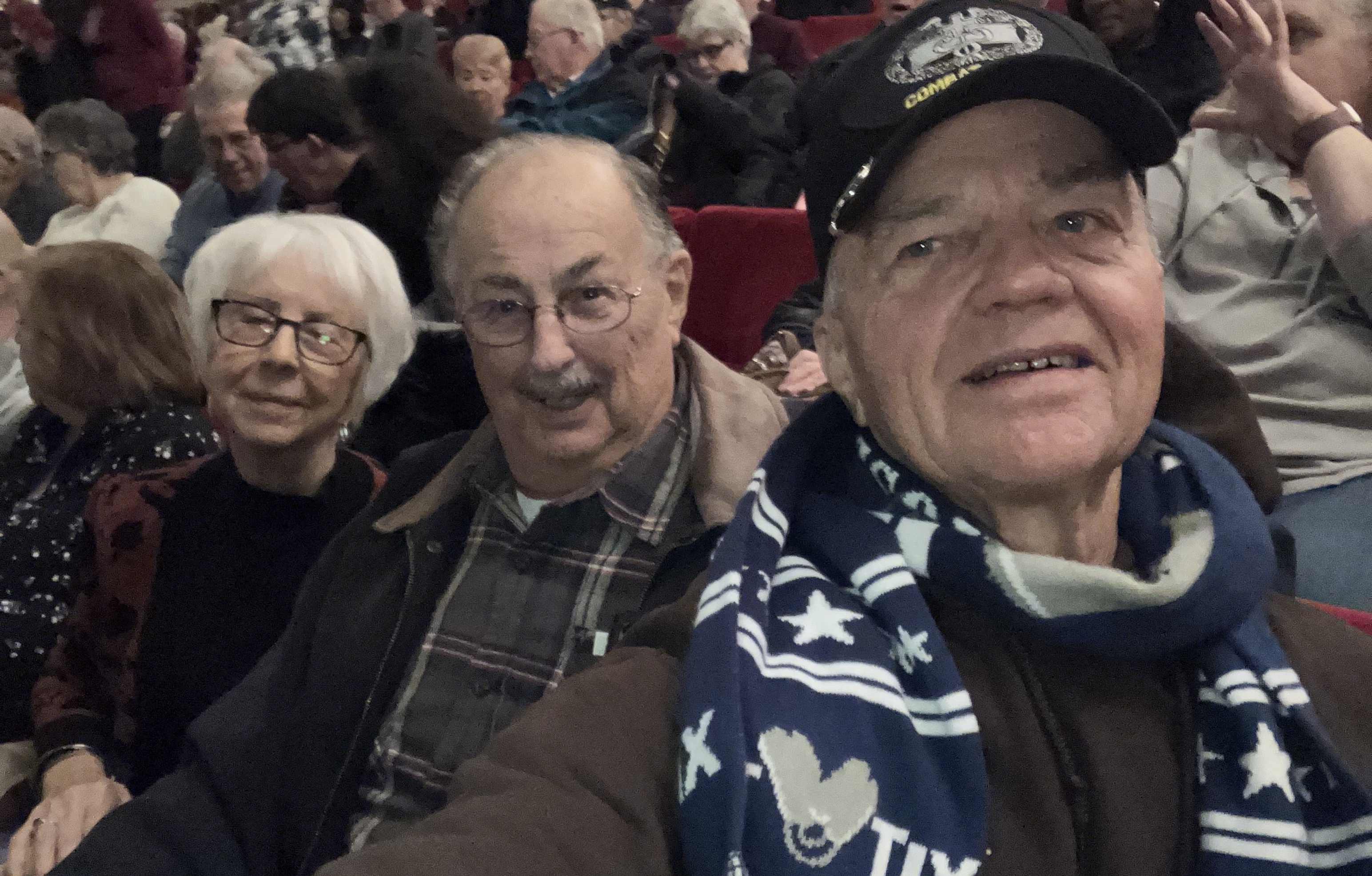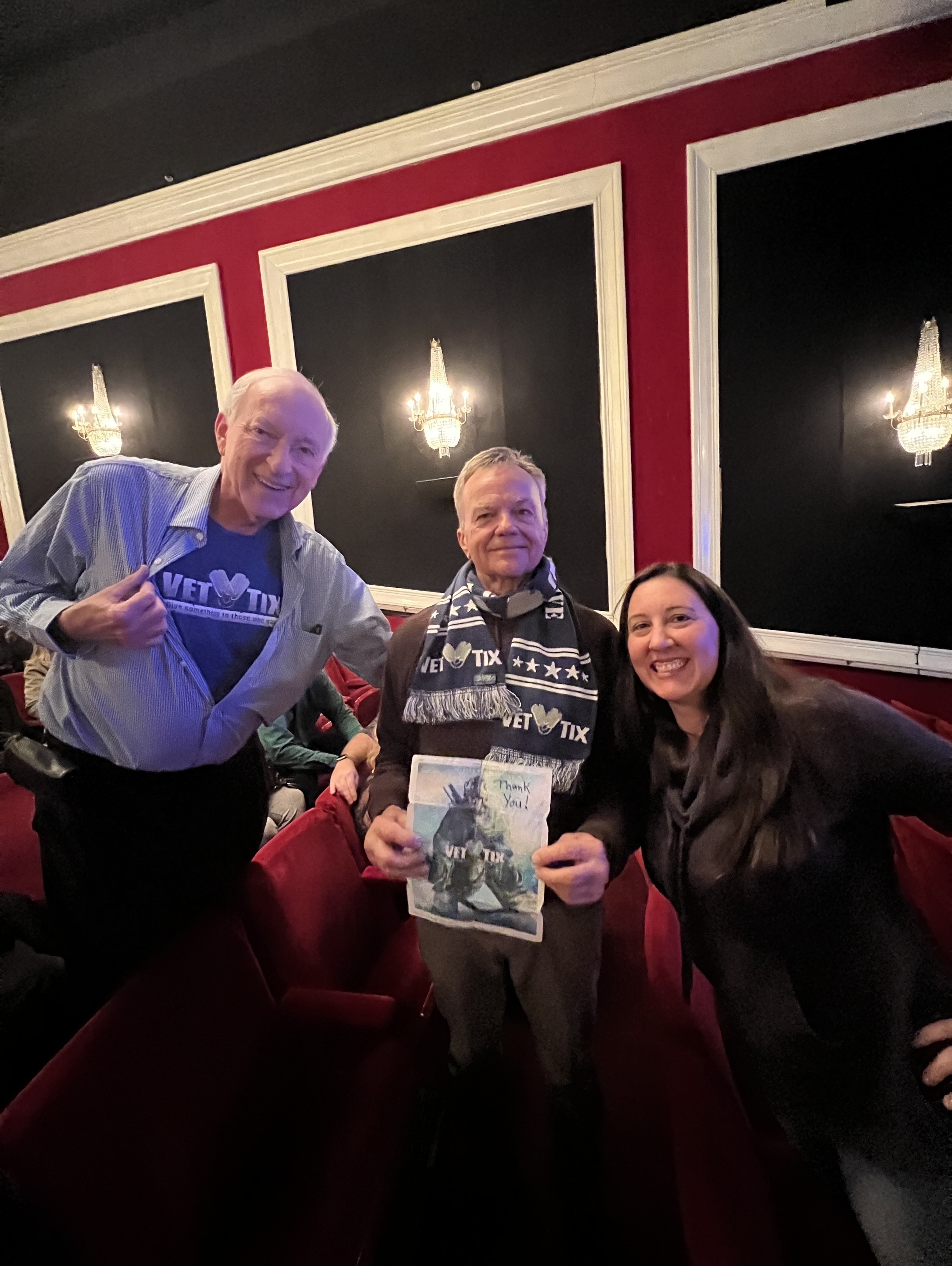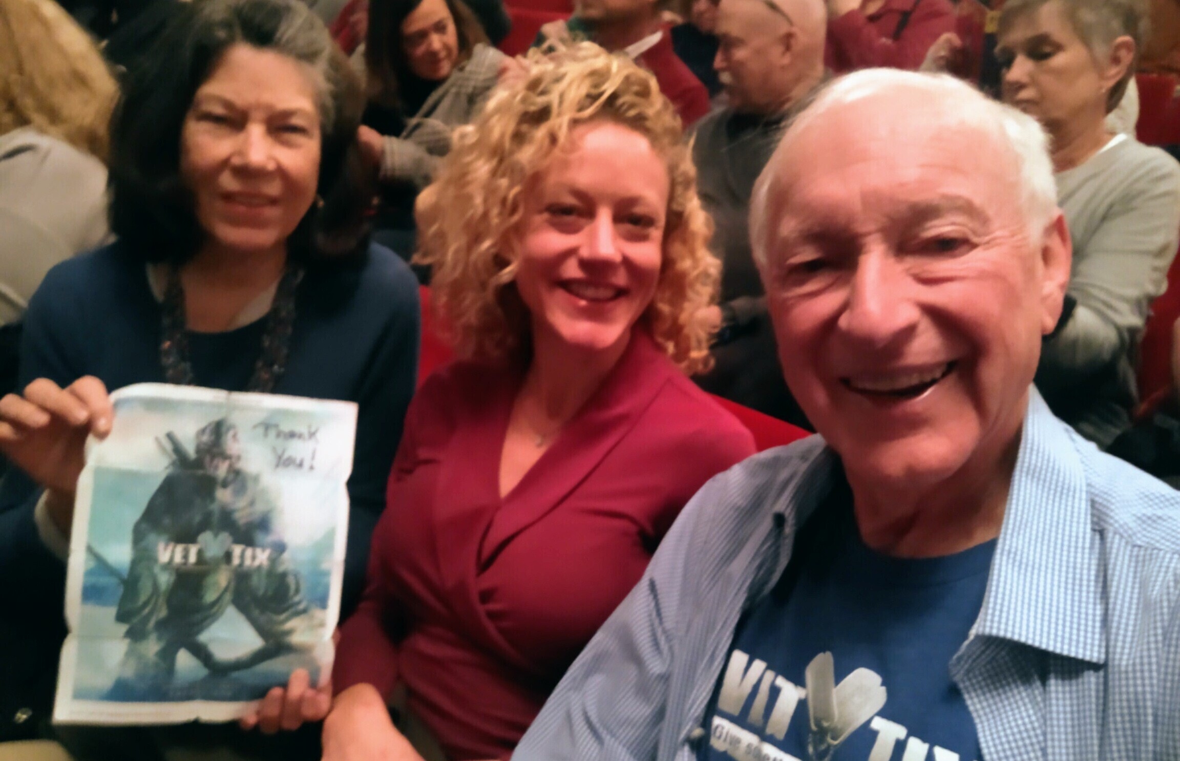 Dear Drury Lane, This was a special show. It wasn’t until intermission that we all realized we were a vet tix section and we all had a love and support fest. Thank you so much for bringing us together and thank you for your support. AND I still have goosebumps from the opening number of Tradition. The show was phenomenal. Photo below is two Vietnam vets and one Global War on Terrorism vet.