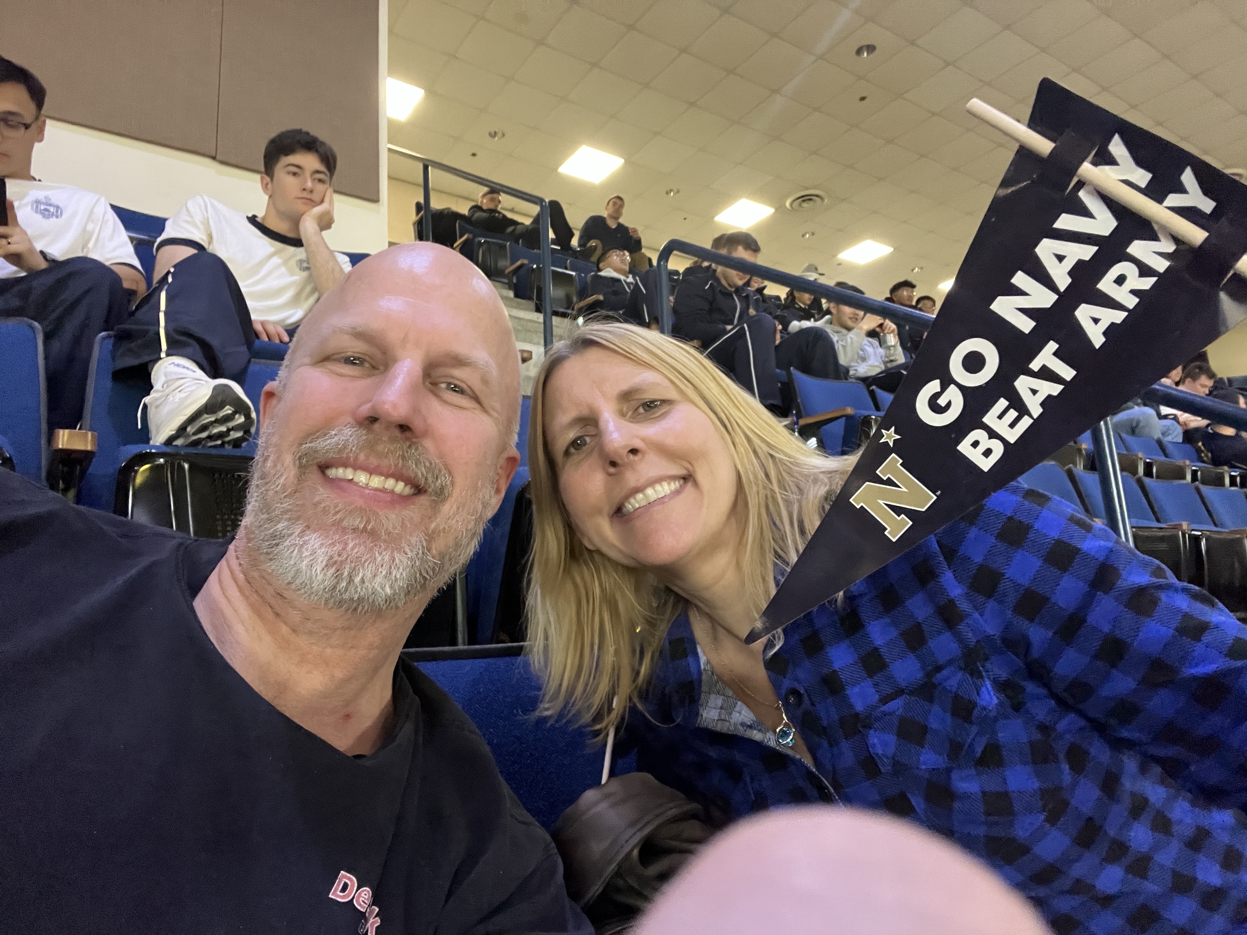 Big thanks to VetTix and USNA Athletics for the opportunity to see the match of the year , versus Army. The men and women traded victories, but it was great cheering for our Mids. Sorry, we forgot our sign at home.