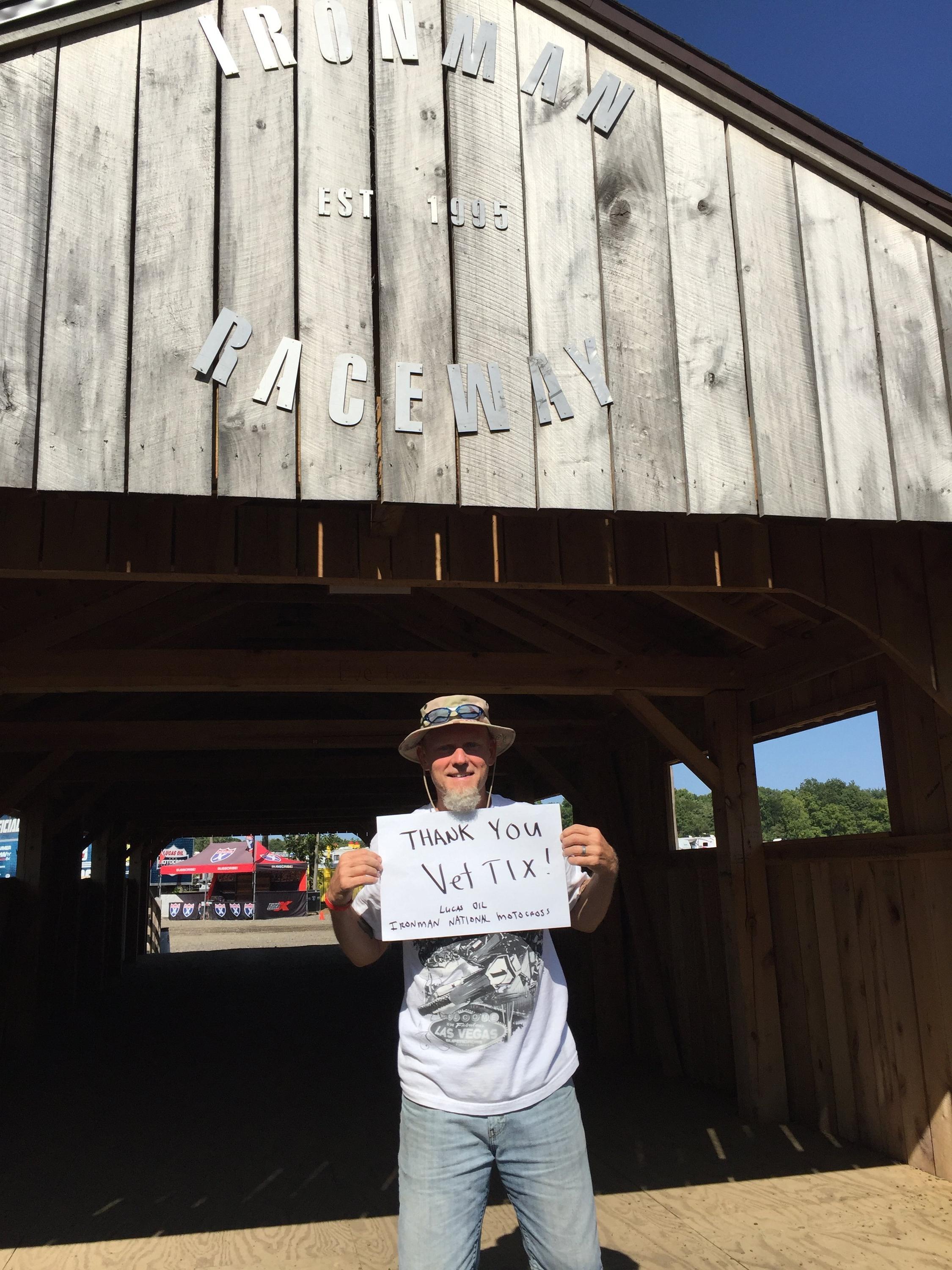 Thanks for the tickets to the Ironman Motocross Championship. My two sons and I had a great time. This USAF K-9 veteran from 1971-75 is very greatful. I'm also fond of the Vet Tix t-shirt I wore for the day.....