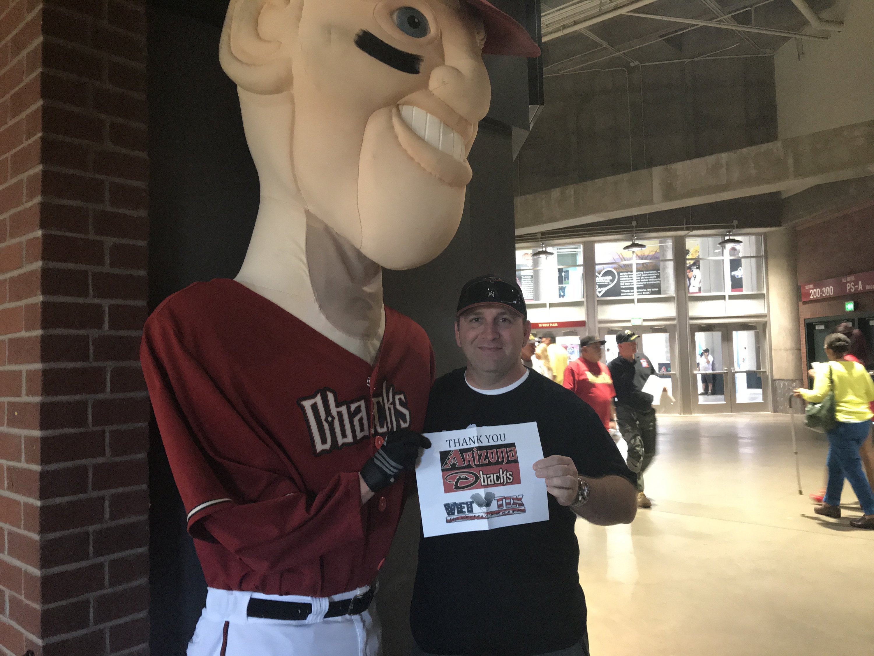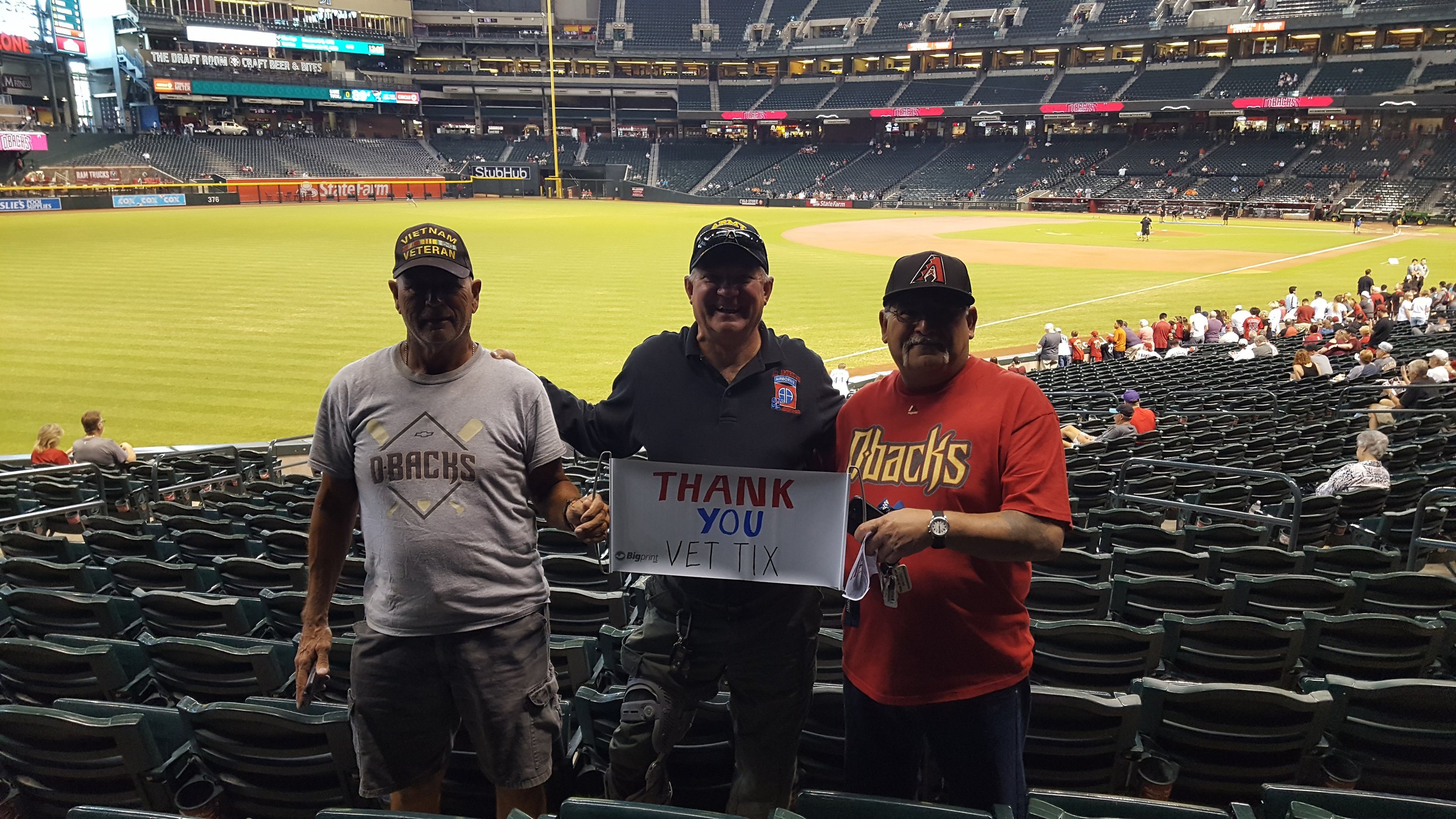 I would like to express our gratitude to the Arizona Diamondbacks, Major League Baseball, our sponsor and Vet-Tix for a wonderful afternoon at Chase Field in downtown Phoenix. We greatly appreciate your generosity to Americas Veterans. Arizona 4 San francisco 3 It went down to the final pitch. THANK YOU !!!!!!!!