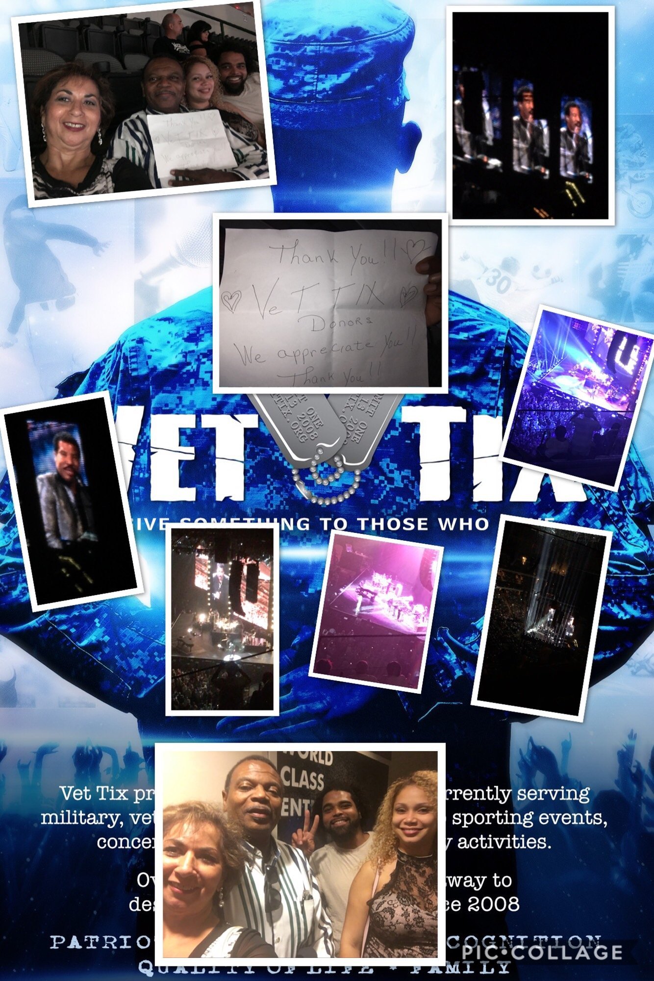 THANK YOU VETTIX AND THANK YOU LIVE NATION FOR THE TICKETS AND ALLOWING ME TO MAKE SO MANY GREAT MEMORIES WITH MY FAMILY. LIVE NATION I THANK YOU FOR DONATING THE TICKETS ME AN MY FAMILY REALY ENJOYED THE CONCERT AND SO MANY FUNNY AND CRAZY MEMORIES WE DANCED AND ENJOYED THE MUSIC, MY KIDS JUST LOVED SEEING US DANCING THAT THEY JOINED IN. VETTIX I THANK YOU ALSO FOR HAVING SUCH A GREAT PROGRAM AND GIVING US VETS THE OPPORTUNITY TO MAKE SUCH GREAT MEMORIES WITH OUR FAMILYS THANK YOU SO VERY MUCH FROM THE MEDINAS.........