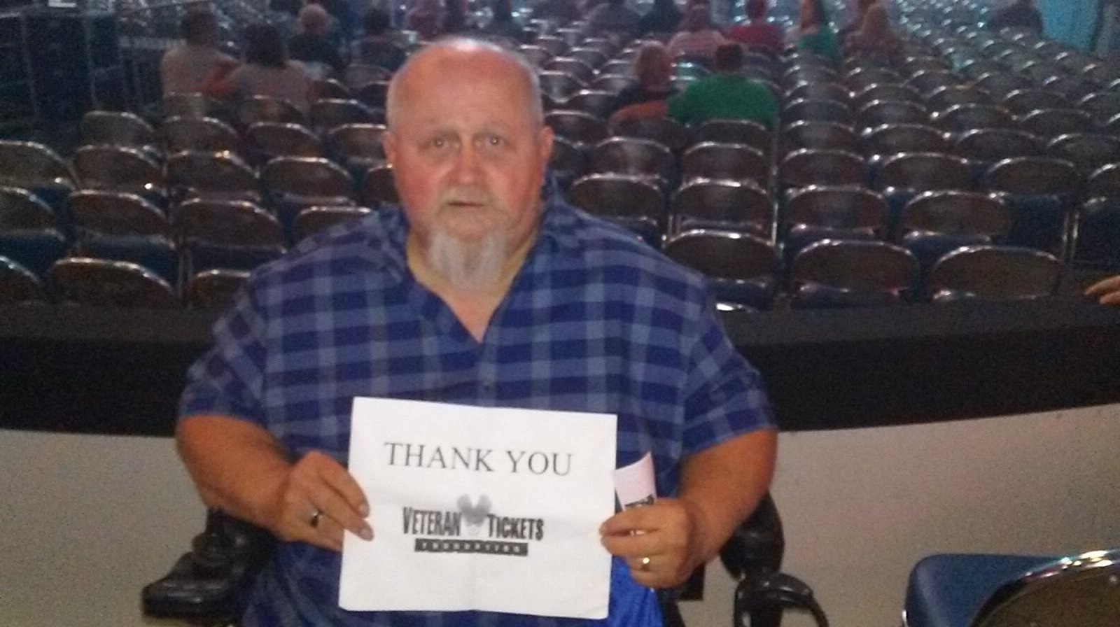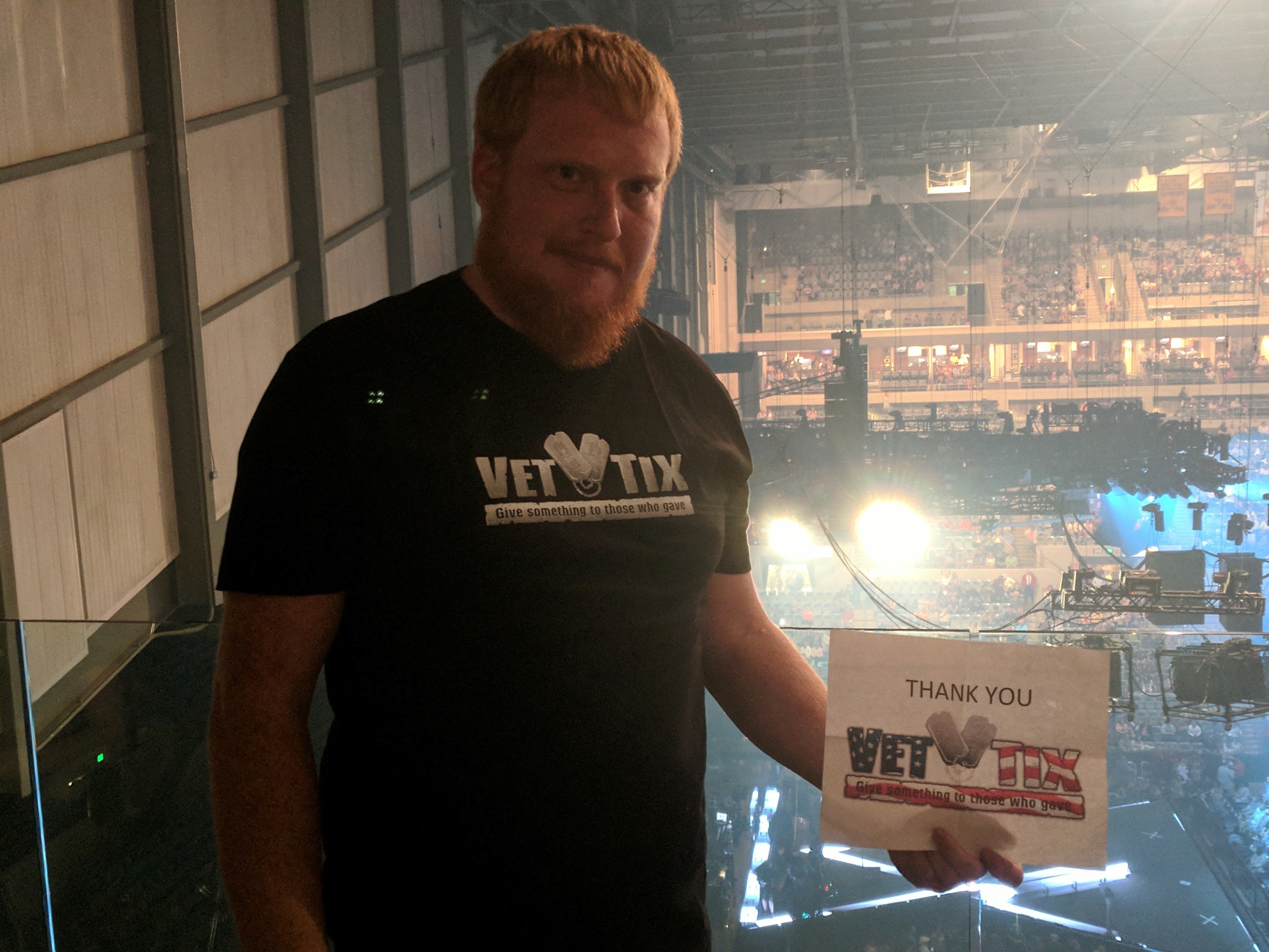 Thank you to Vet Tix and Messina Touring Group. This was an excellent concert. We had a great time. Met a lot of fellow vets. My husband is not a fan of country music but had an excellent time at this show. Thank you for giving us the opportunity to see such a great show! P.s. I am wearing my Vet Tix shirt but my sign covers it up.