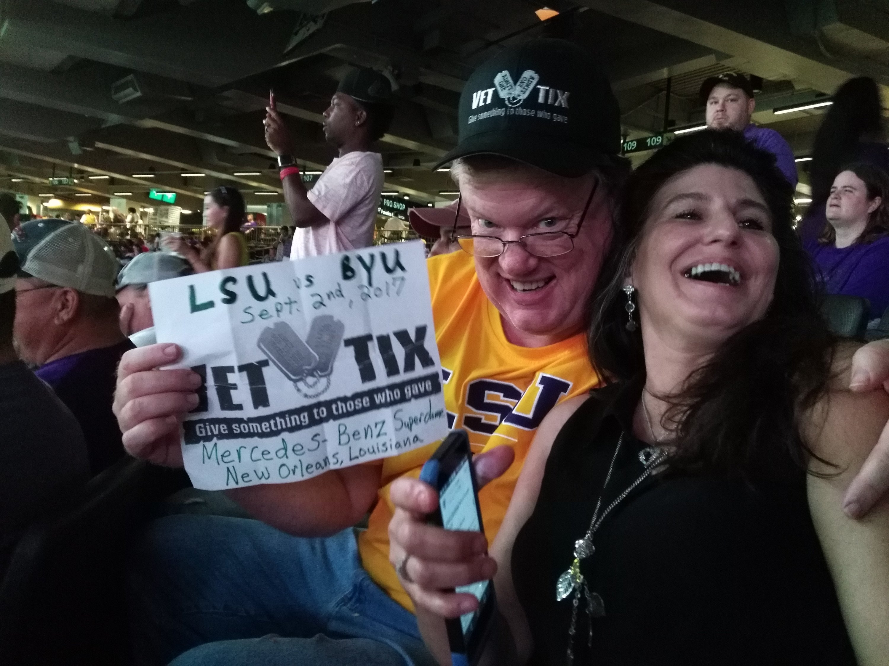 Due to the devastation of Hurricane Harvey, this game was changed at the last minute to New Orleans. My friends and I were very excited to see LSU Football in the New Orleans Superdome. The tickets that you provide were such good seats, we felt like VIP's. Our seats were on the field level and provided us complete live game action viewing. We truly felt honored due to your generosity. Thank you for enhancing the lives of veterans and their families with your continued donations. Regards,