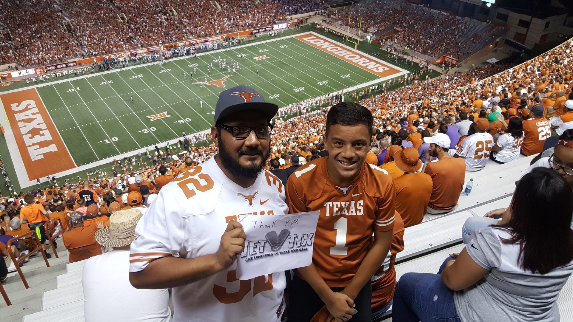 I would like to thank The University of Texas Athletics department, The NCAA, the individual donors and VETTIX for the tickets that allowed me to take my Dad who served in Viet Nam to his first Longhorn football, game. It was a special time. You have the thanks of both a father and son, both Navy veterans who would not have had this time without you. .