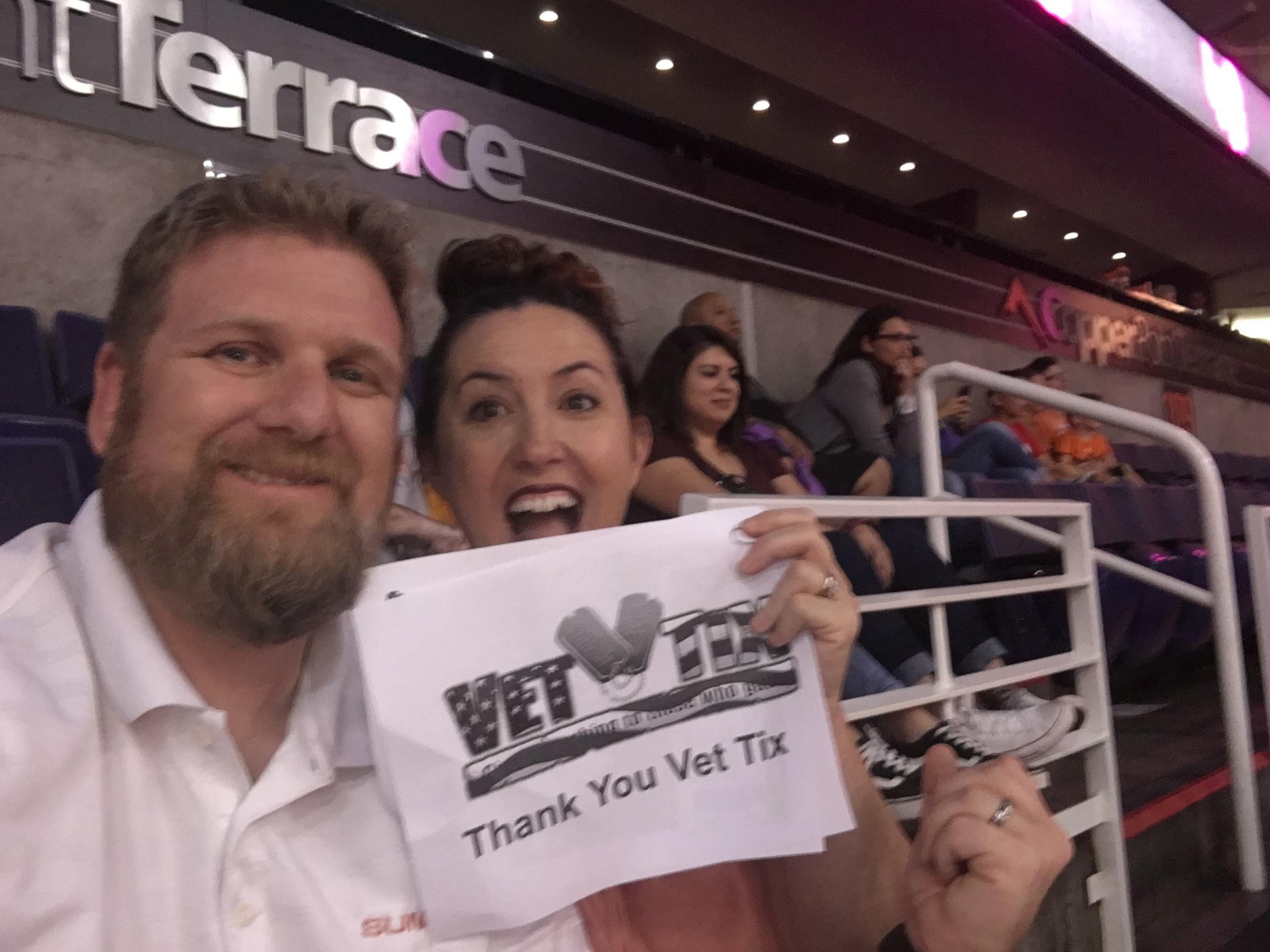 Great game with plenty of crowd excitement. Special thanks to the Phoenix Suns for the tickets & great seats. We appreciate your hospitality and thoughtfullness. In addition, what Vet-Tix is doing for us Veterans is totally awsome - thank you t👀. Great Times thanks to you both.