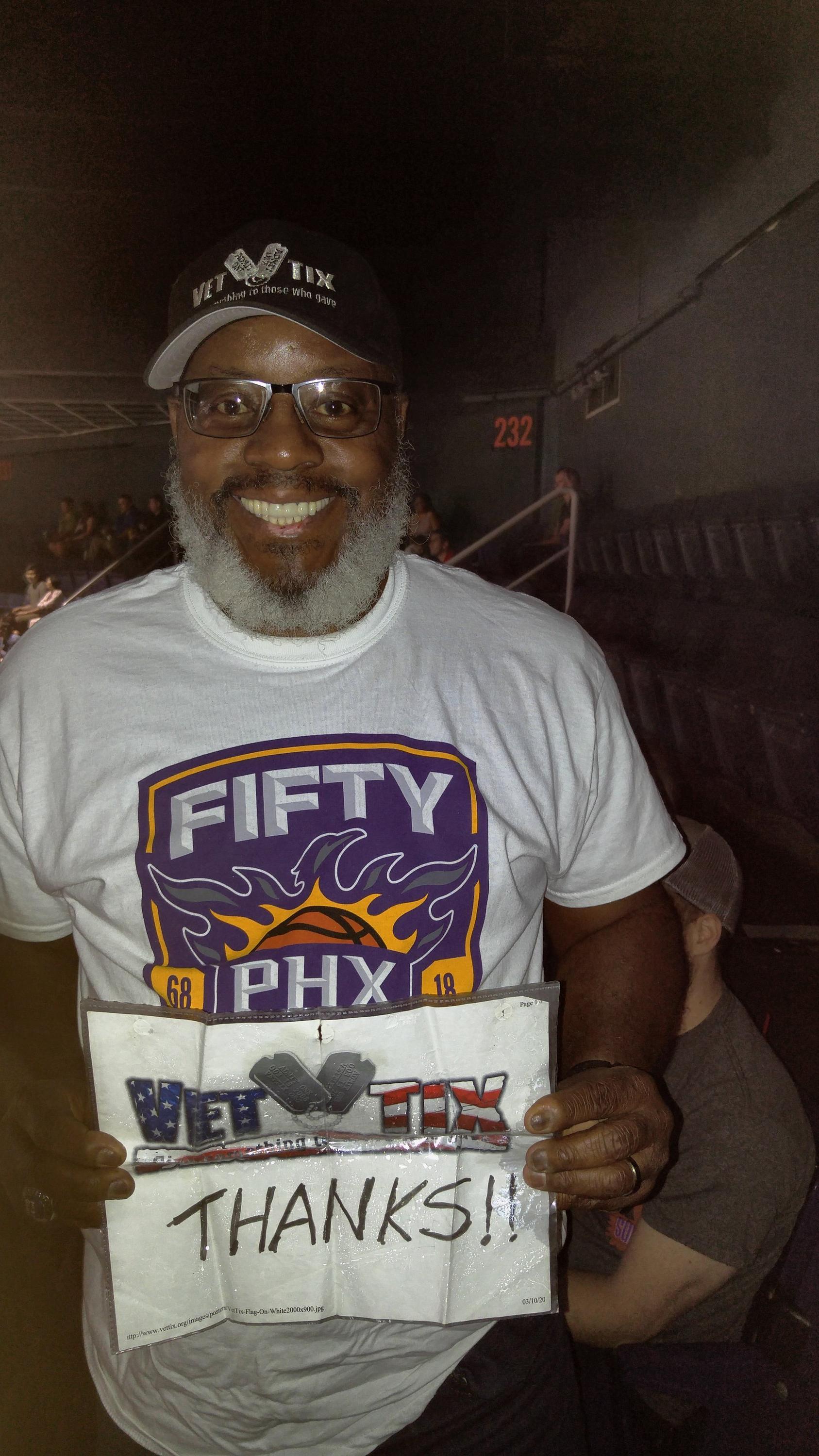 I would like to thank the Phoenix Suns Organization and Vettix for the opportunity to watch the game with my friends!!! It is always a special moment to watch a live game, especially the Phoenix Suns. Thanks to the Phoenix Suns organization and Vettix that makes our prior service to this great country more gratifying. The Suns and Jazz gave us an exciting and thrilling game to watch live. Thank you again for allowing my son and I the opportunity to enjoy this great event. God Bless.