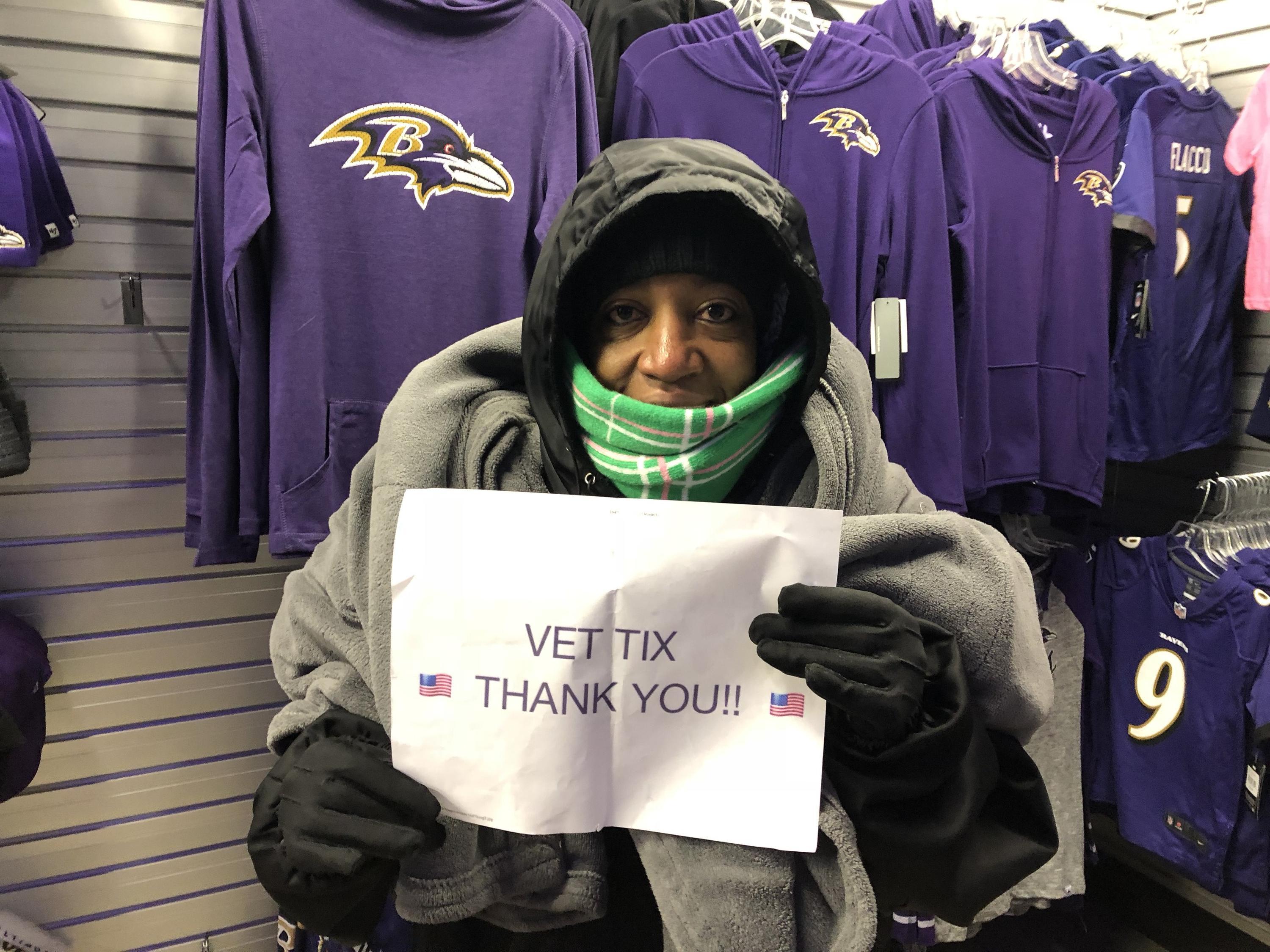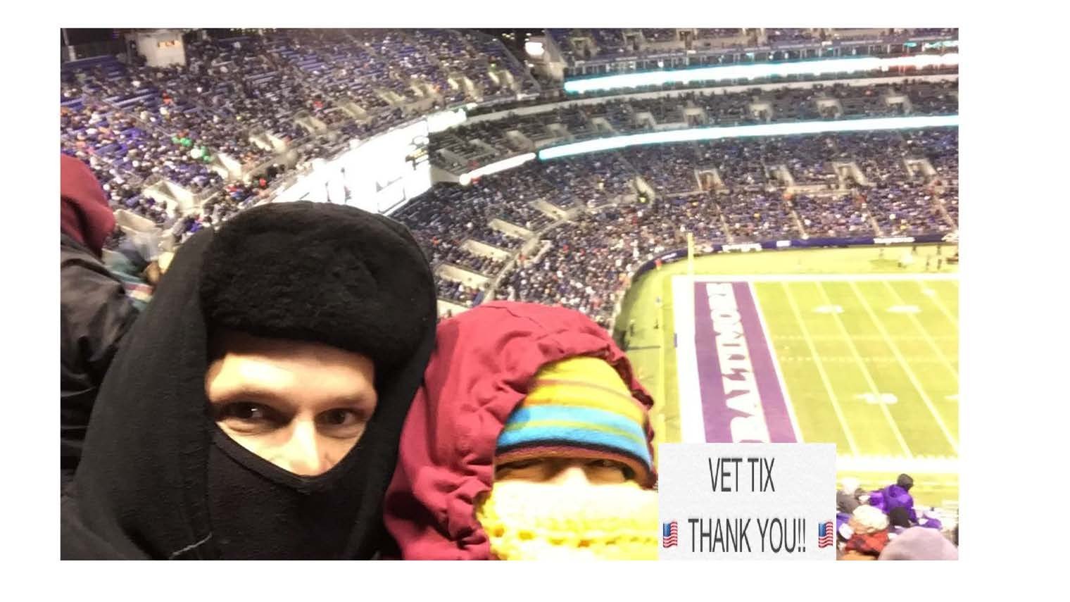 Thank you so much for the tickets to the Ravens game. We were able to take our good friends, one of which is also an Army Vet who just came home from Flight school. It was freezing but it was a great time.