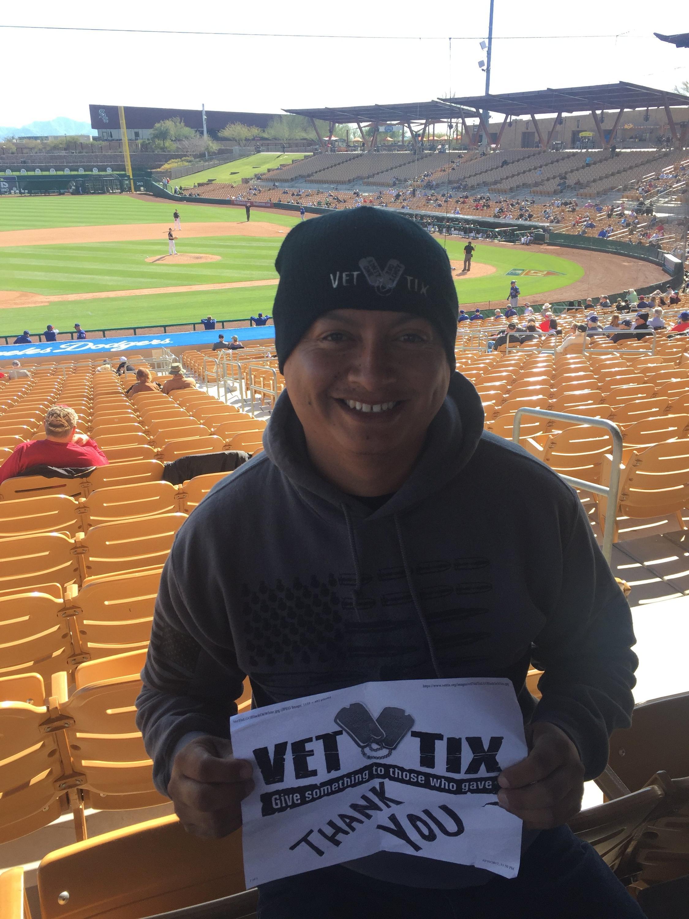 Thank you vettix.org and Camelback Ranch MLB spring training for donating the tickets to vettix.org. We certainly enjoyed the White Sox vs Texas Rangers game on Wednesday. It was a very exciting game and the White Sox were losing up until the bottom of the eighth inning and then they turned around and kicked butt! The Park is beautiful, the food was good, and the entire staff were fantastic. Thank you again Camelback Ranch MLB spring training for donating the tickets to vettix.org so that we could win them.