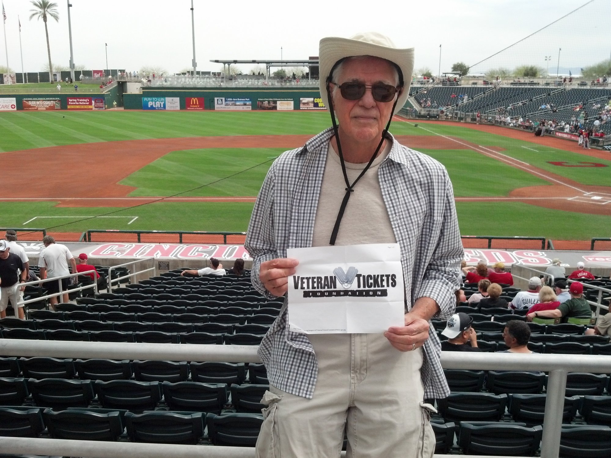 Thank you to the Cincinnati Reds, Goodyear Ballpark and Vet Tix for tickets to the game. Great seats behind third base line. Pleasant day, cloudy but nice temperature, nice day at the ballpark.