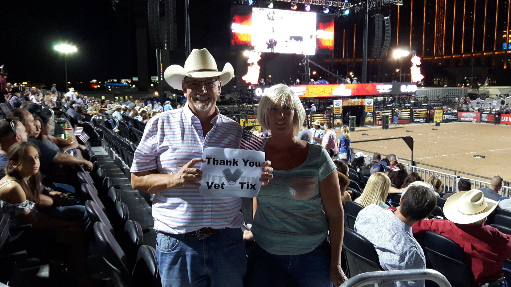 I want to thank the Professional Bull Riders Inc for the 2 tickets to the open night of the Las Vegas Elks Helldorado Days - PBR Last Cowboy Standing. My wife & I really enjoyed the experience and we sincerely appreciate your generosity. I also want to thank Vet Tix for a great program helping veterans.
